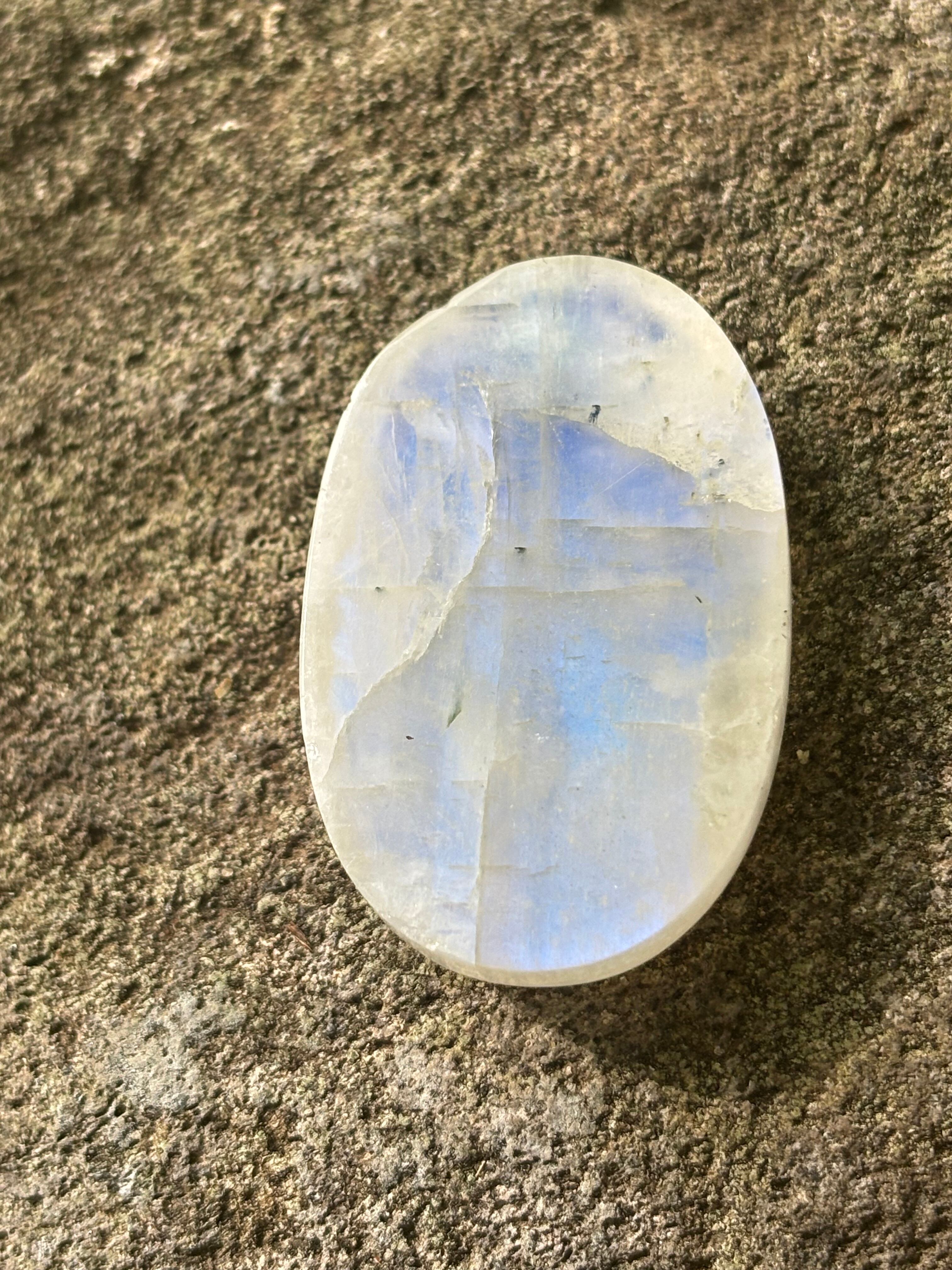 マダガスカル産の特別なレインボームーンストーンの大粒ルースです。美しいブルーのシラーが魅力で、まるで宇宙の星空を思わせる神秘的な輝きが特長です。この一点物のレインボームーンストーンは、特別感あふれる逸品で、どんな場面でも存在感を発揮します。