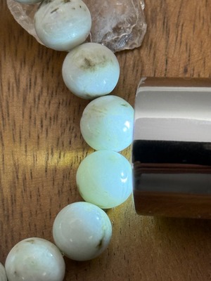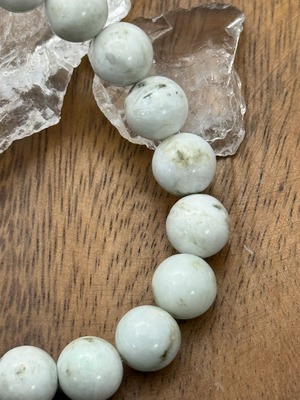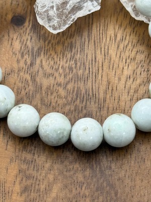 この糸魚川翡翠10mm珠ブレスレットは、純白の清らかさと、やわらかな緑が溶け合う白緑翡翠を使用した特別な一本です。