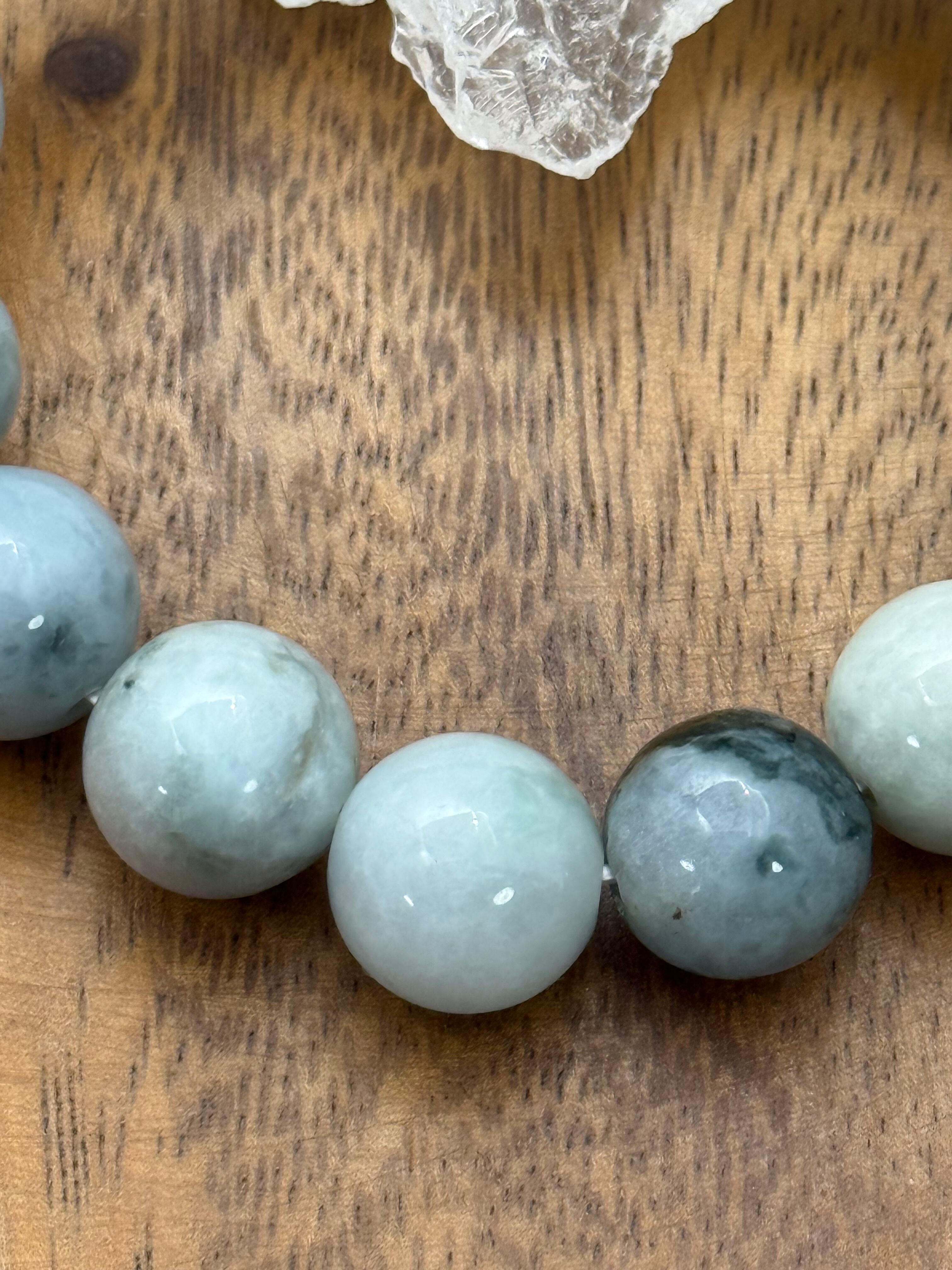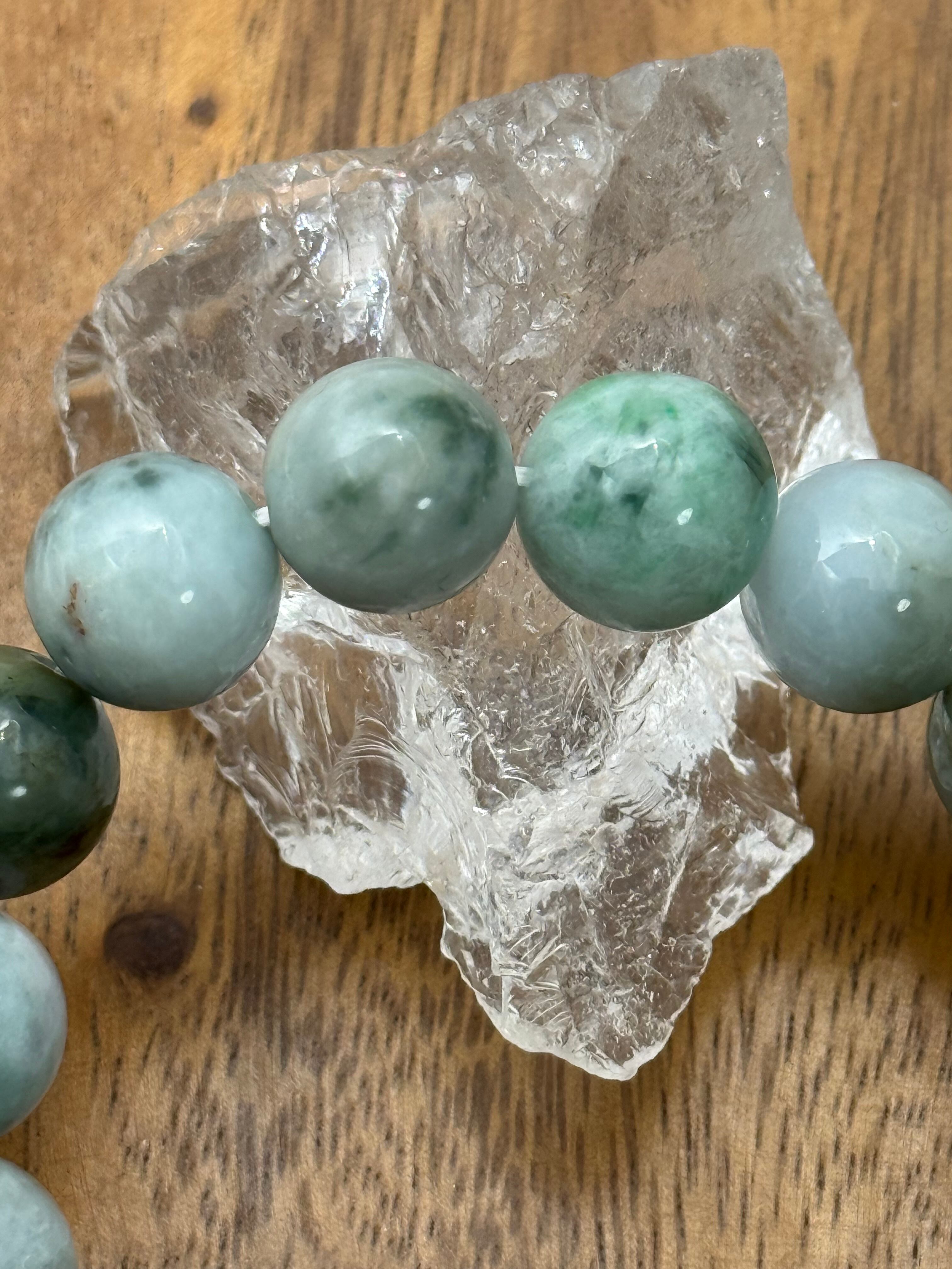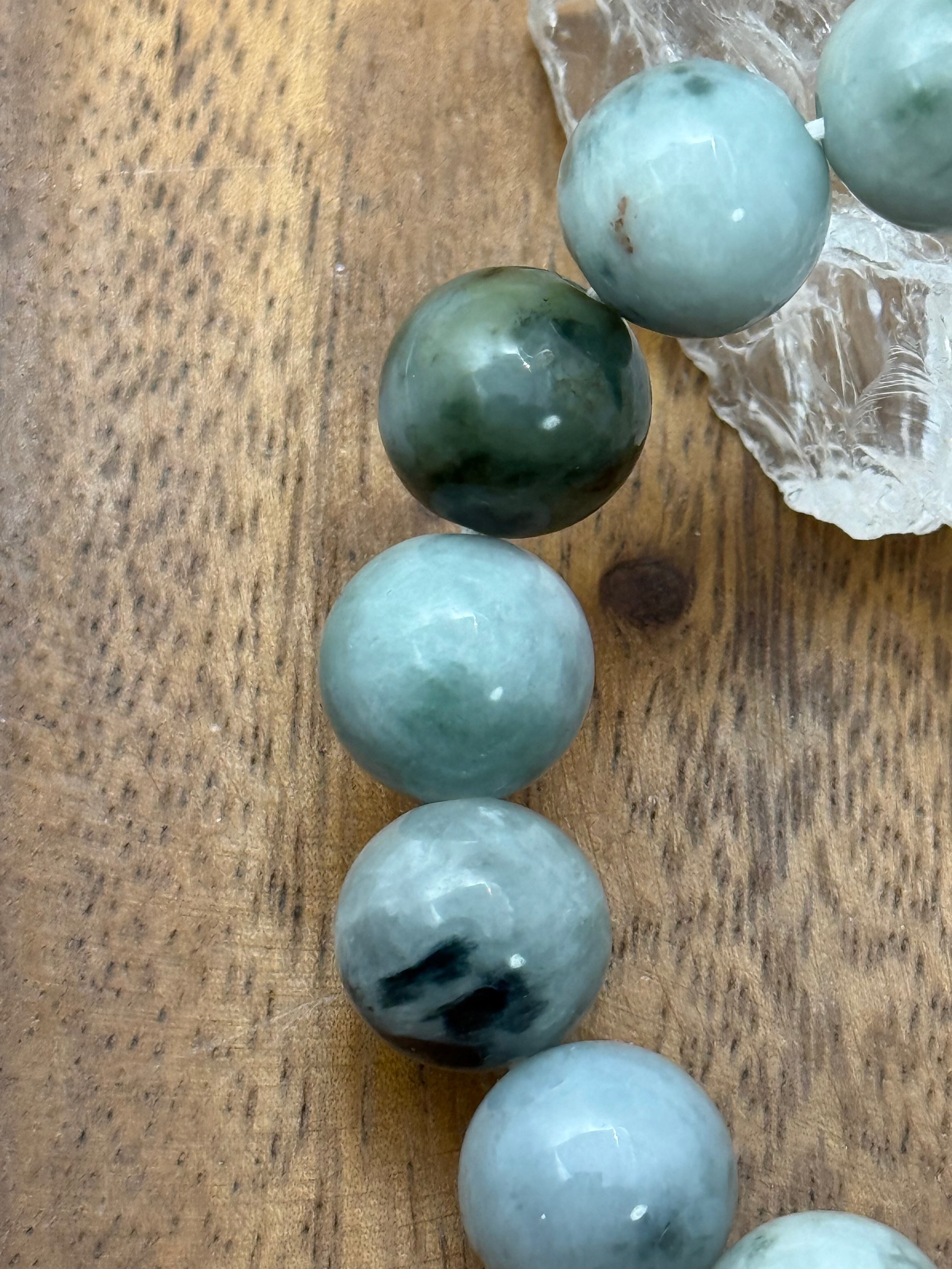 ミャンマー産翡翠の中でも、ロウカン質特有の艶と透明感を感じられる、13mm珠のマーブル模様ブレスレットです。