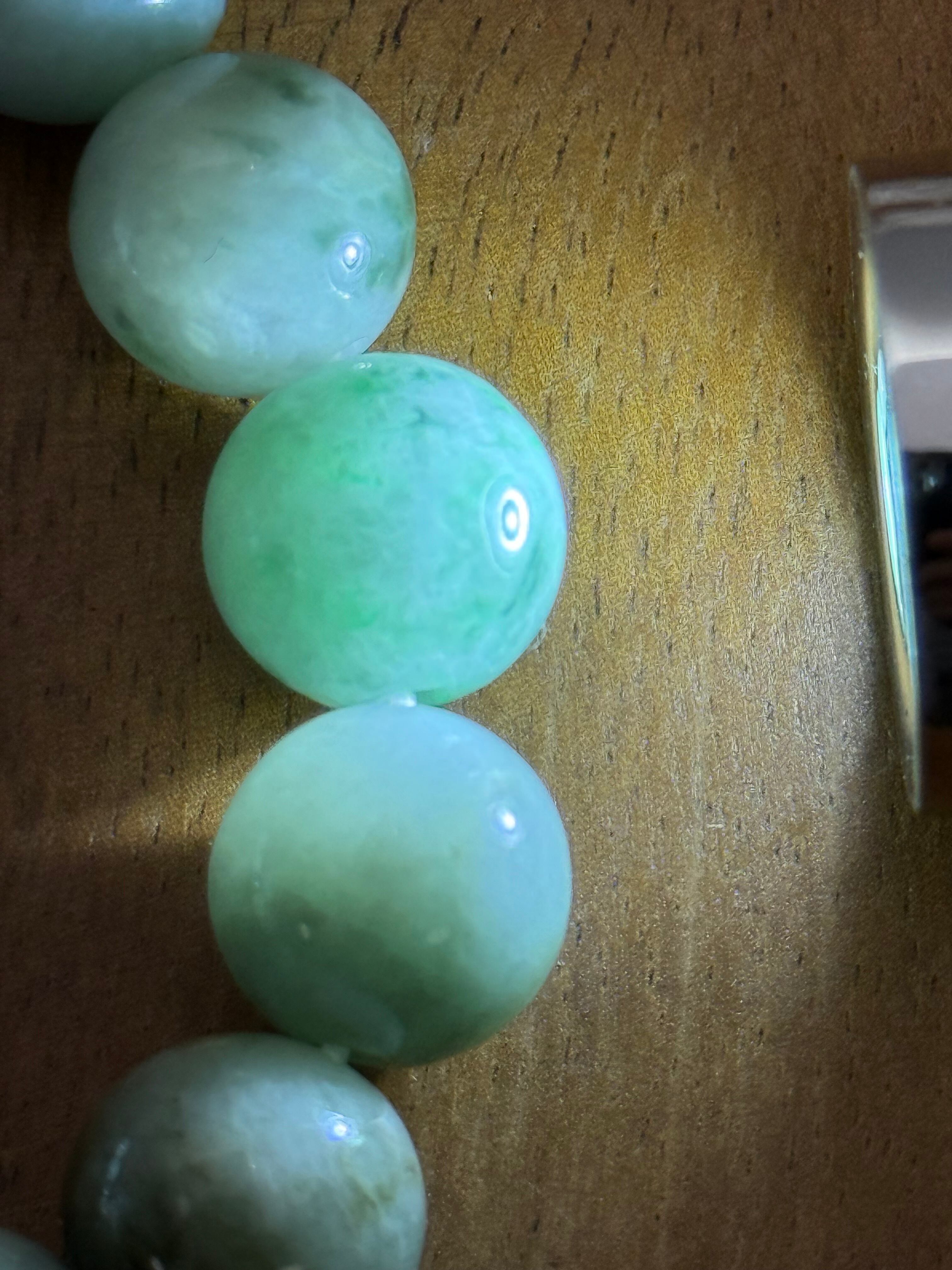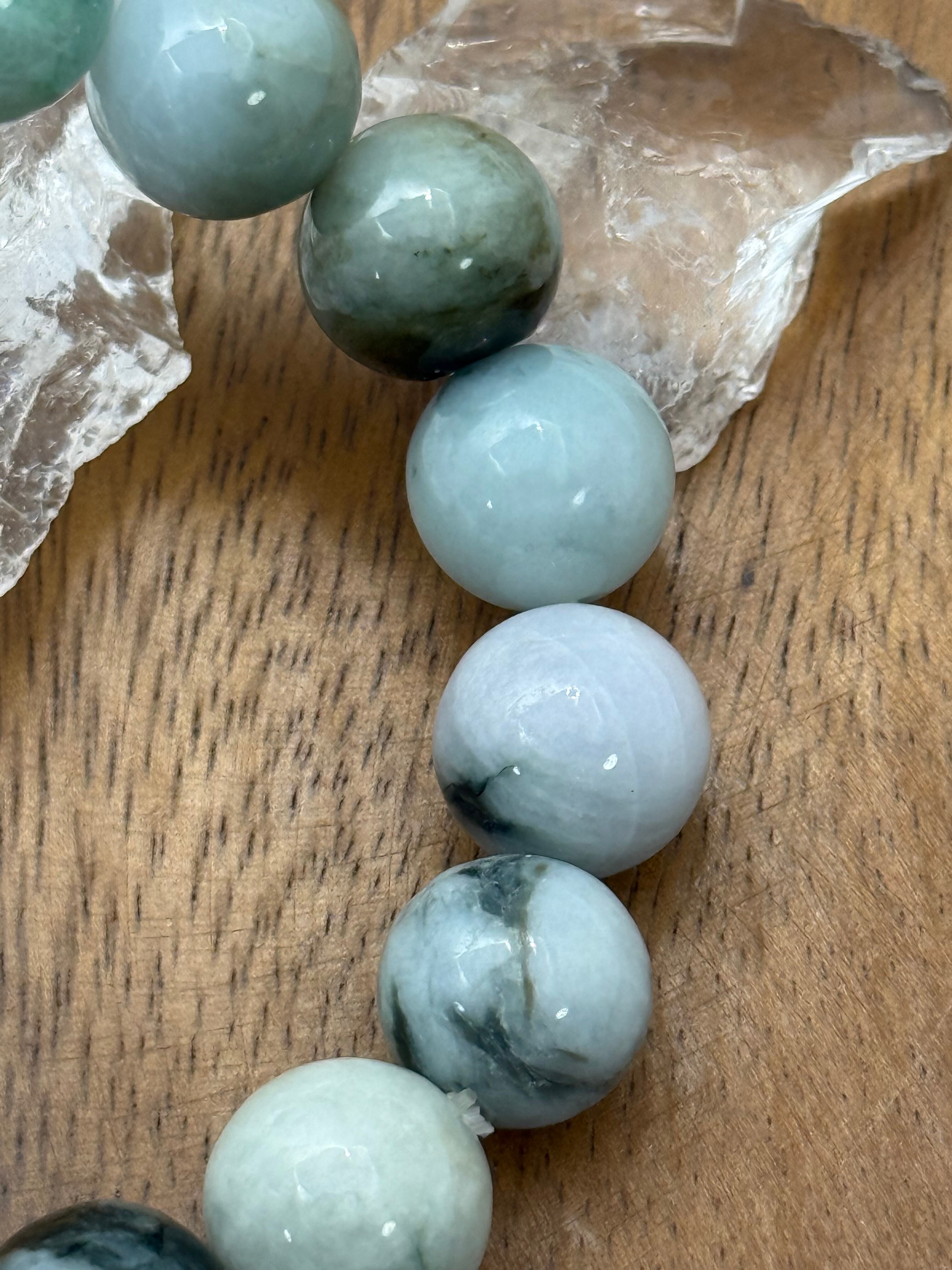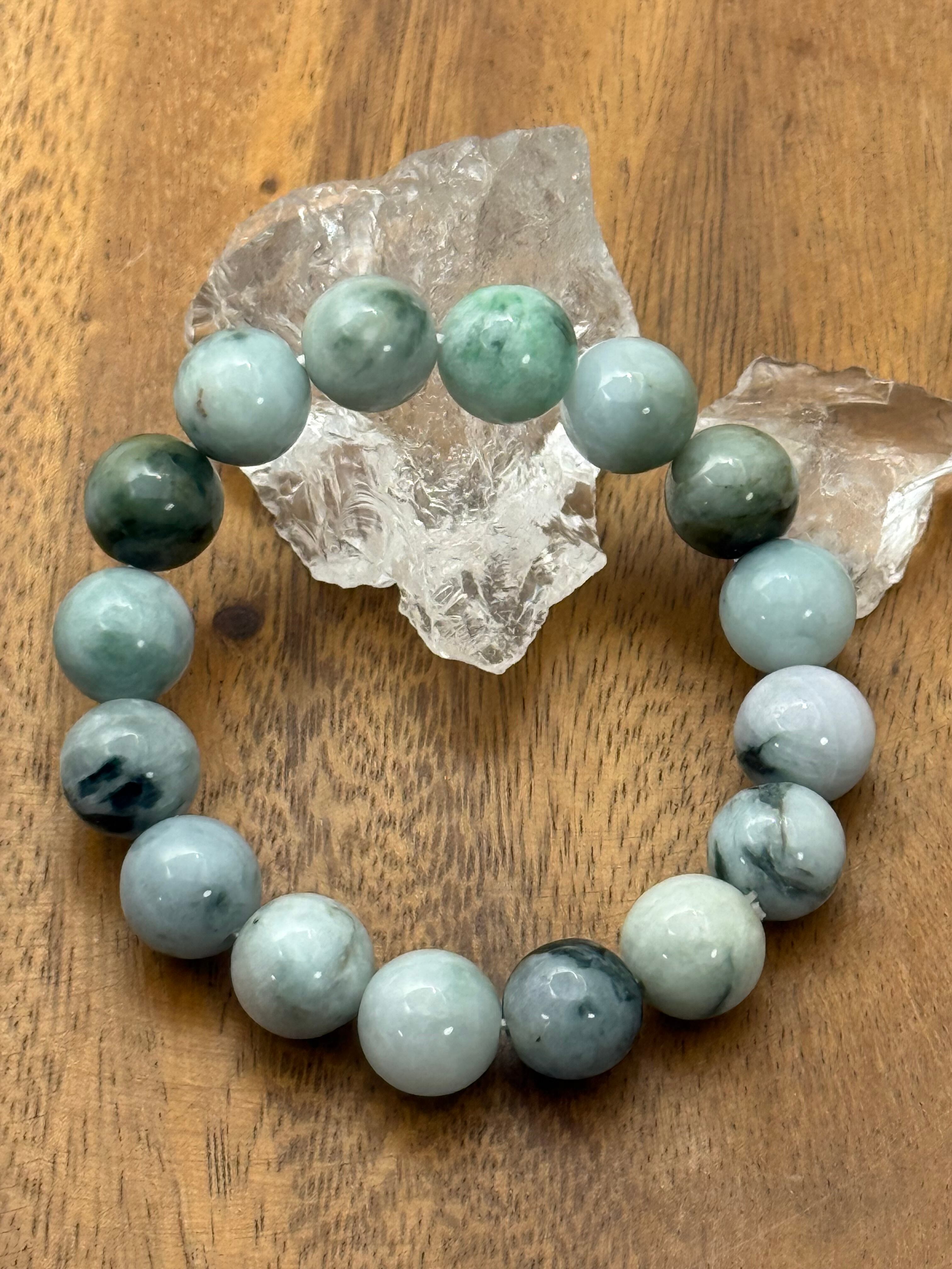 ミャンマー産翡翠の中でも、ロウカン質特有の艶と透明感を感じられる、13mm珠のマーブル模様ブレスレットです。
