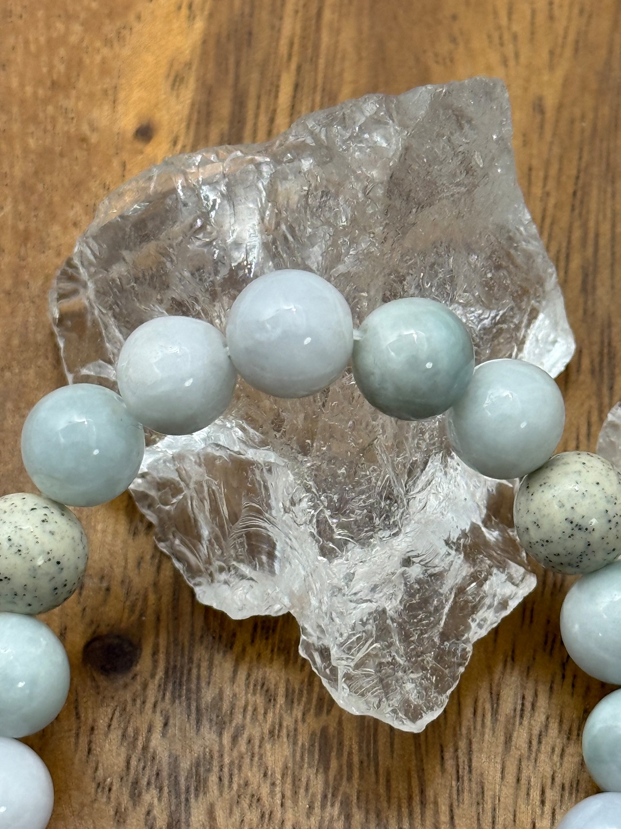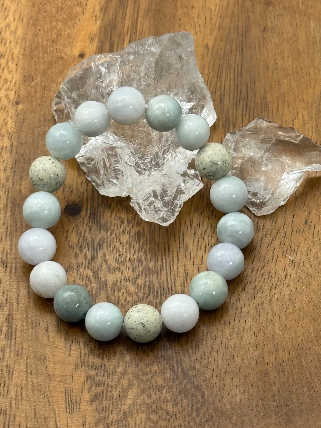 ミャンマー産翡翠と北投石を組み合わせた、10mm珠の特別なブレスレットです。