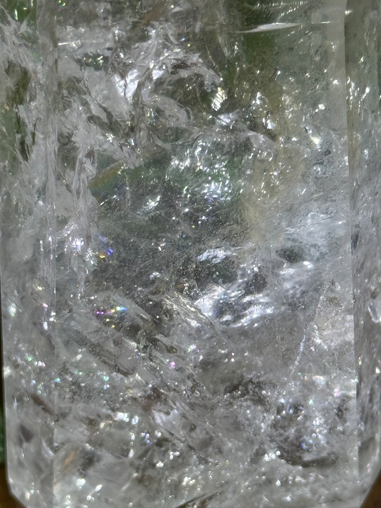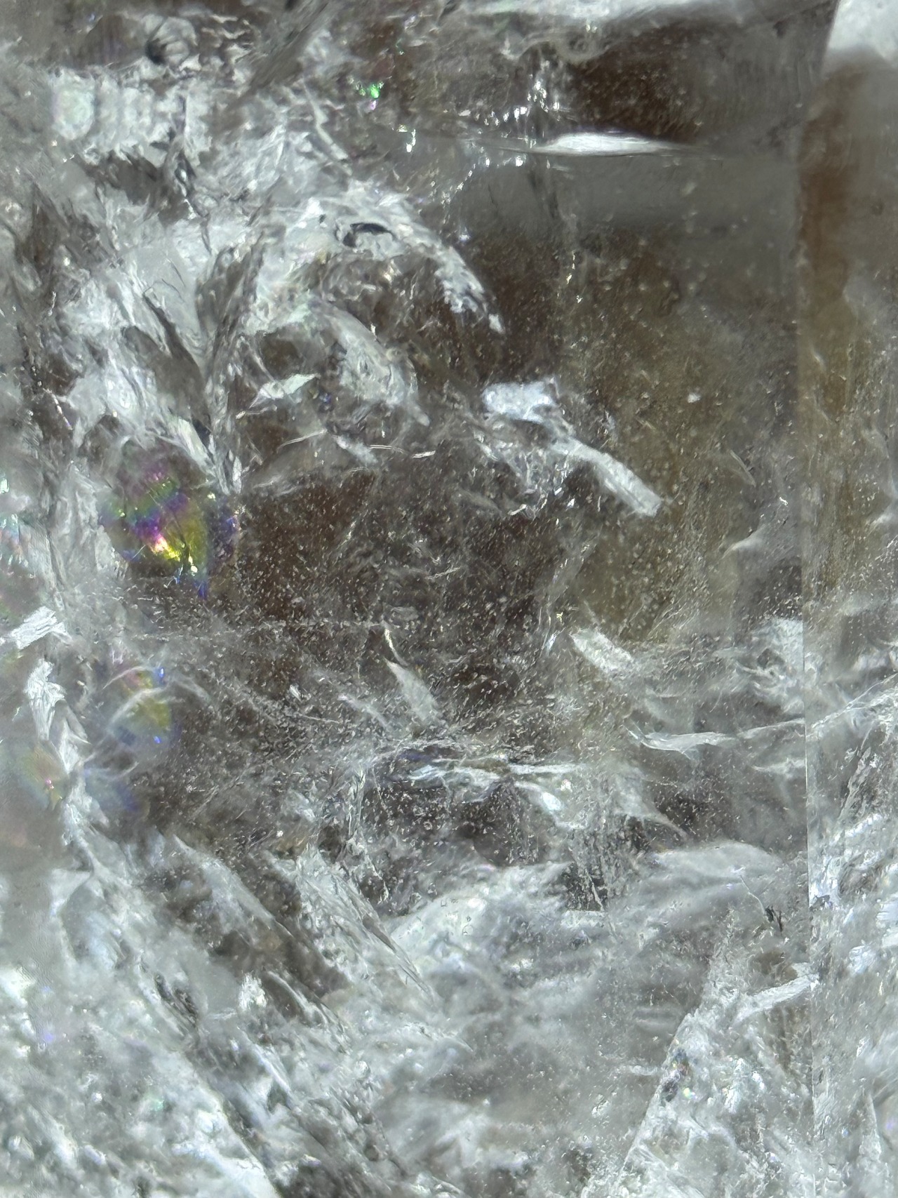 透明度の高い結晶の中に現れる**アイリス(虹色の光)**が印象的な一点物です。