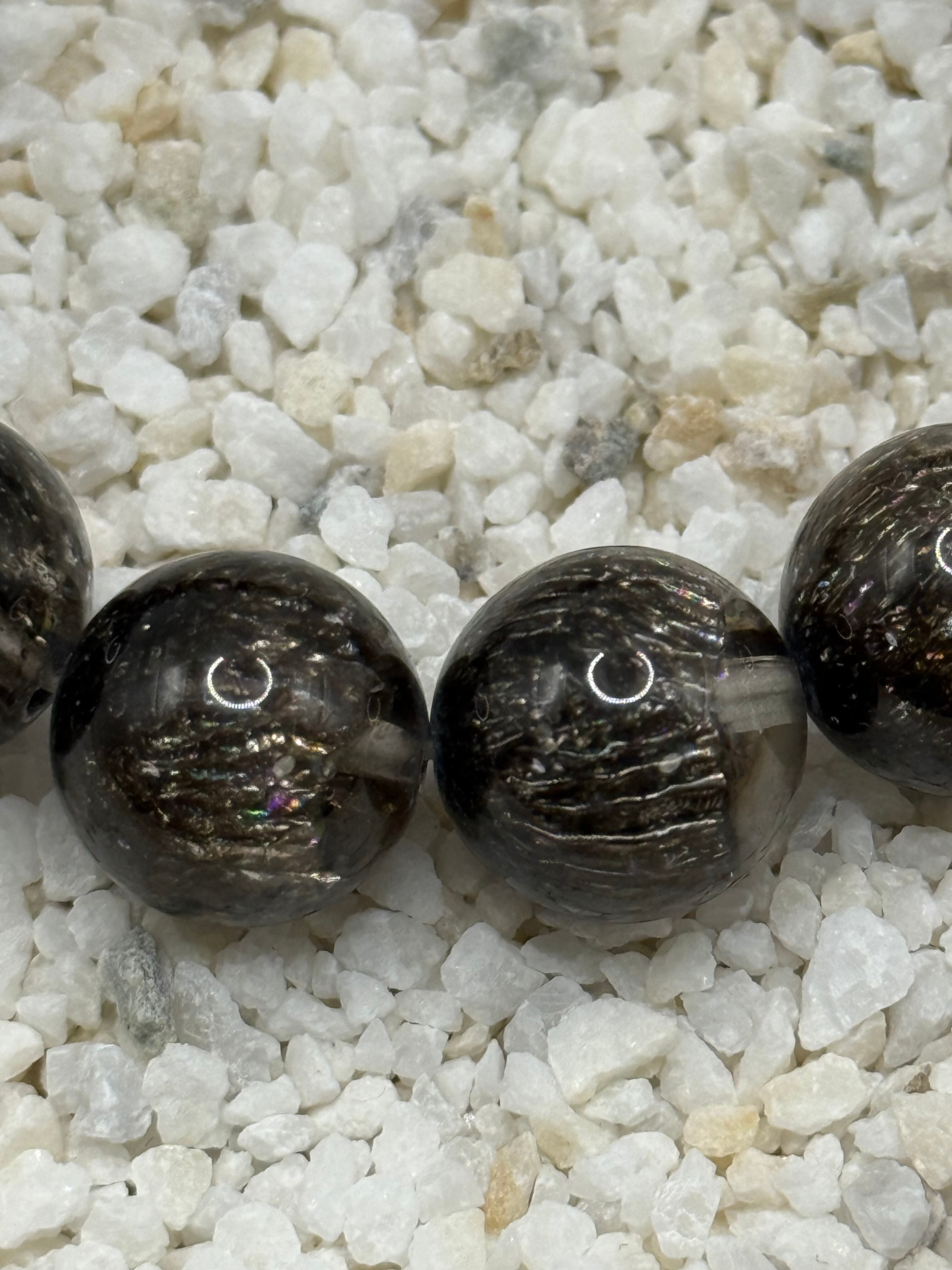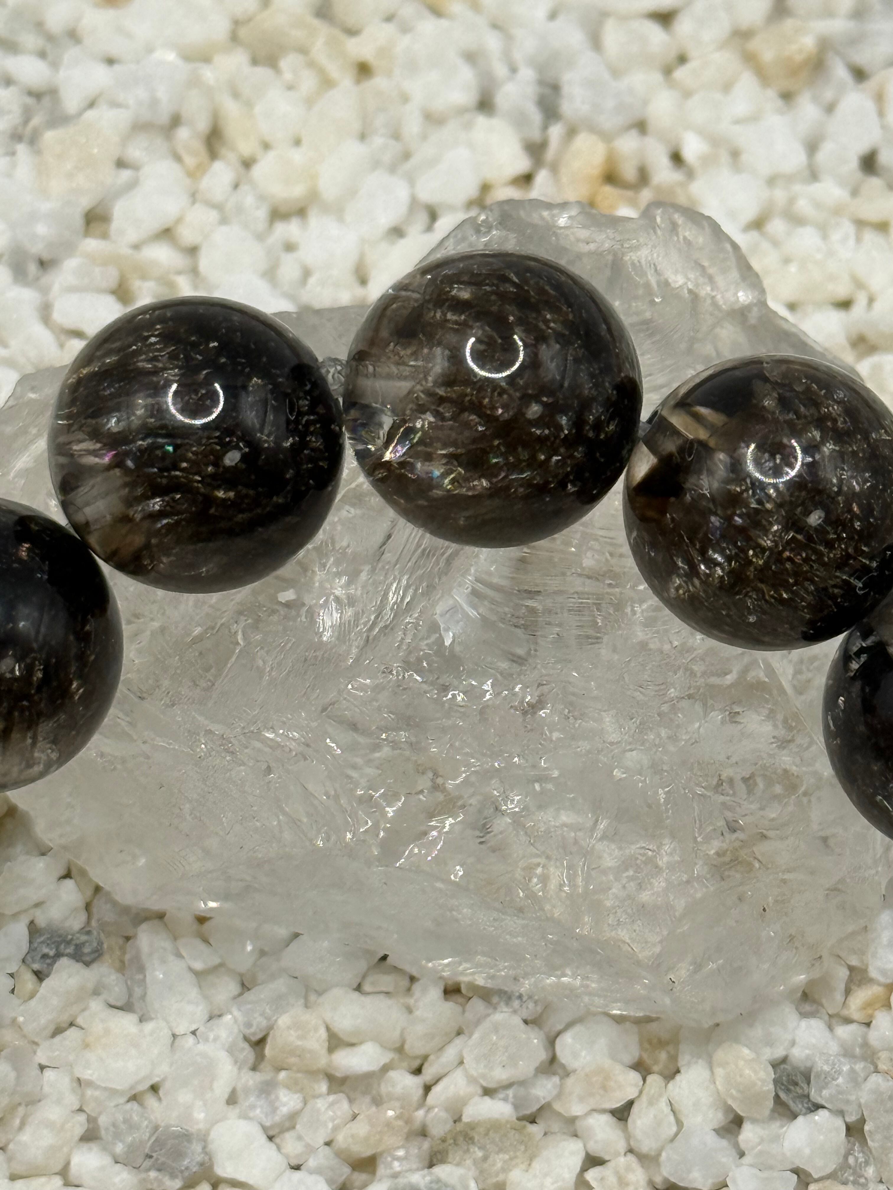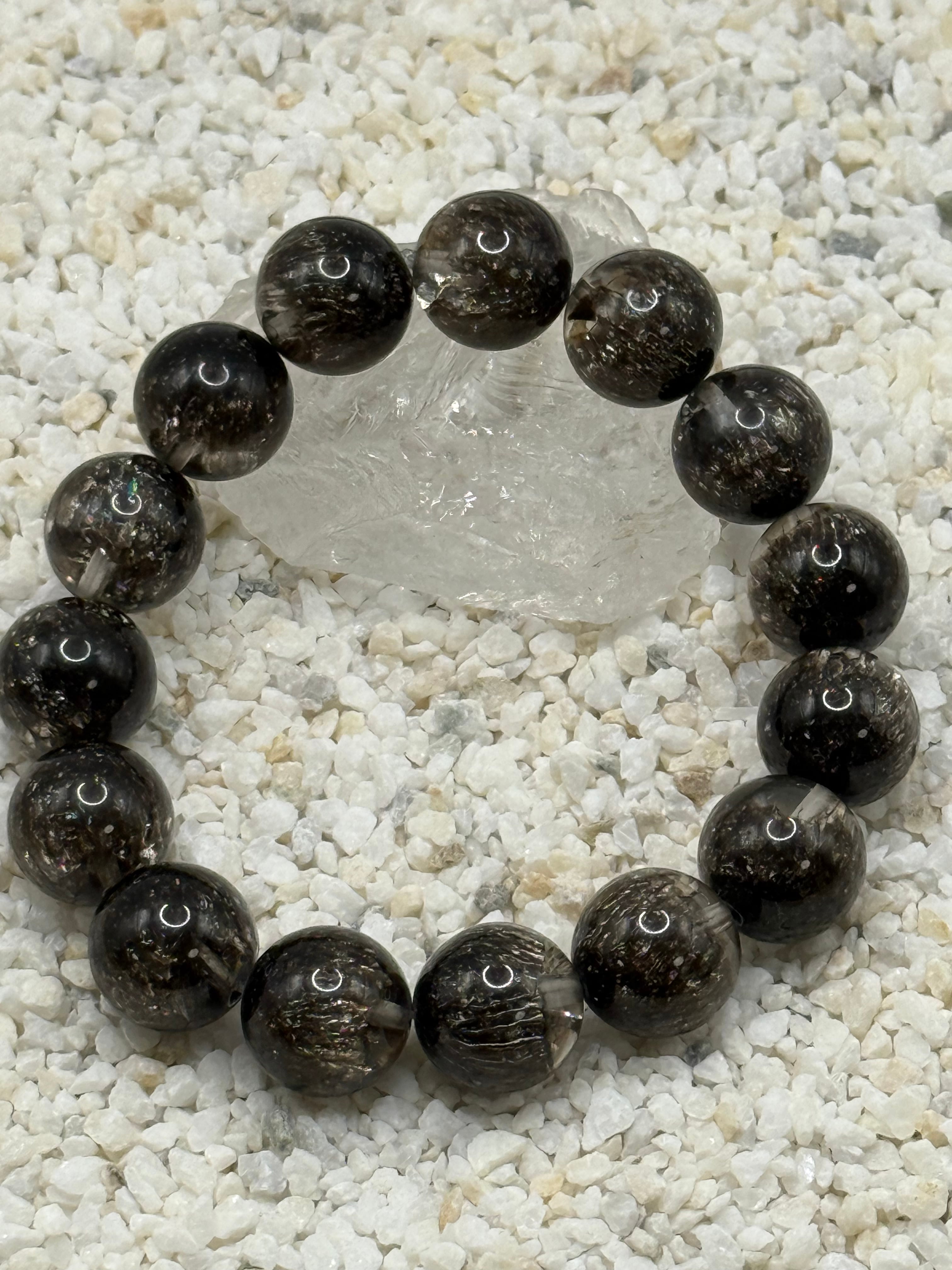 希少な天然石です。15mm珠ブレスレットは、透明感のある水晶の中に、