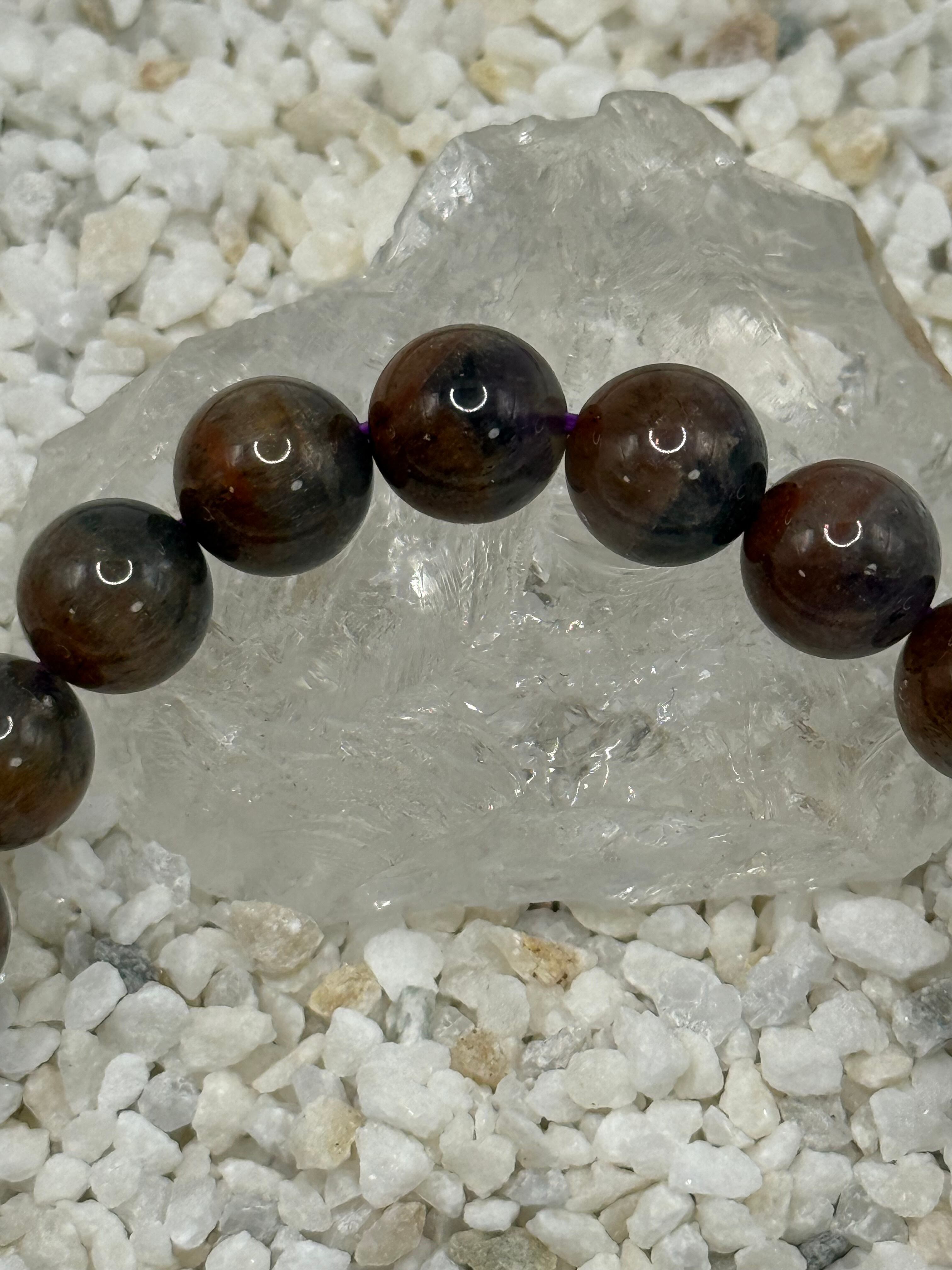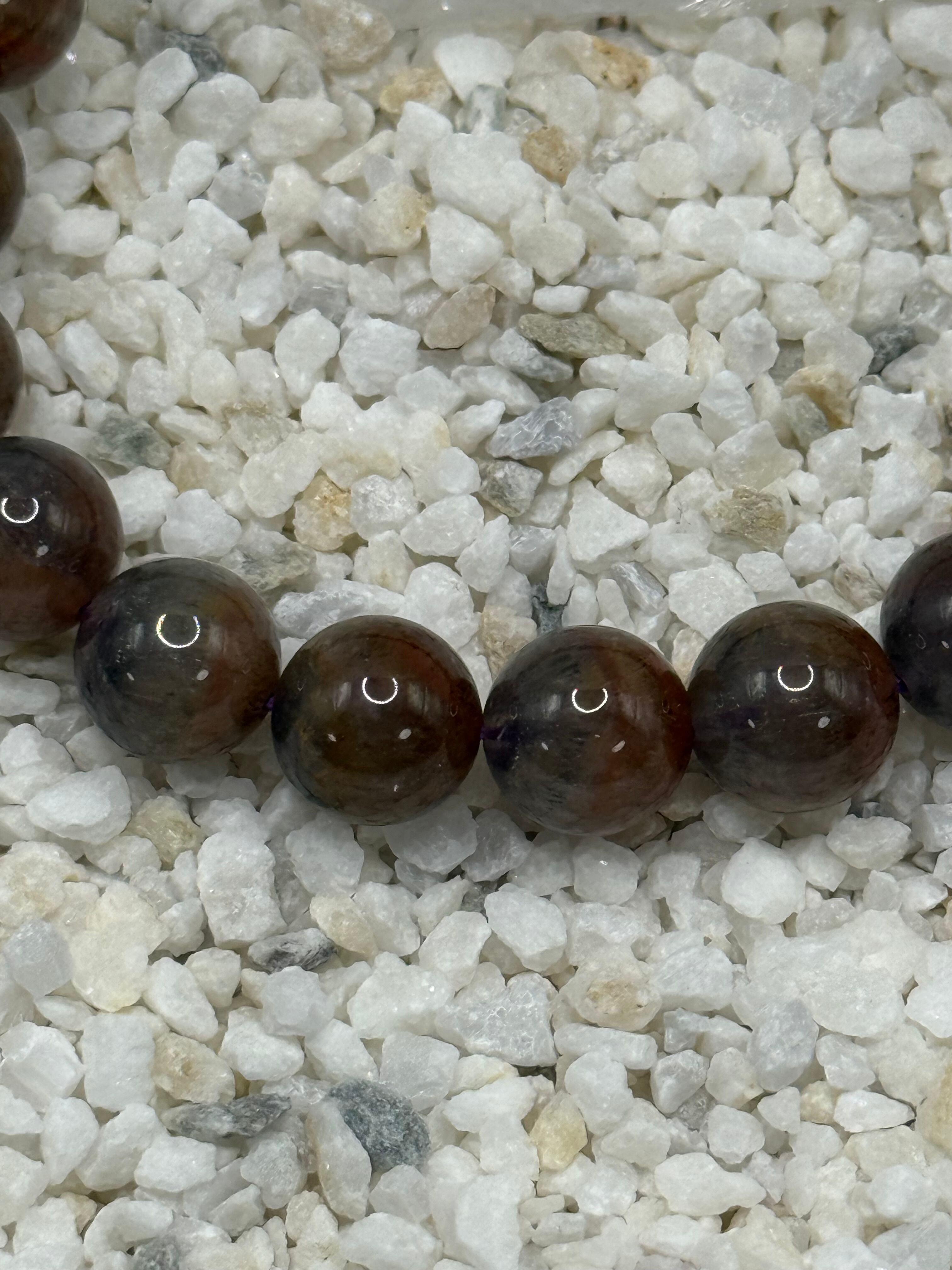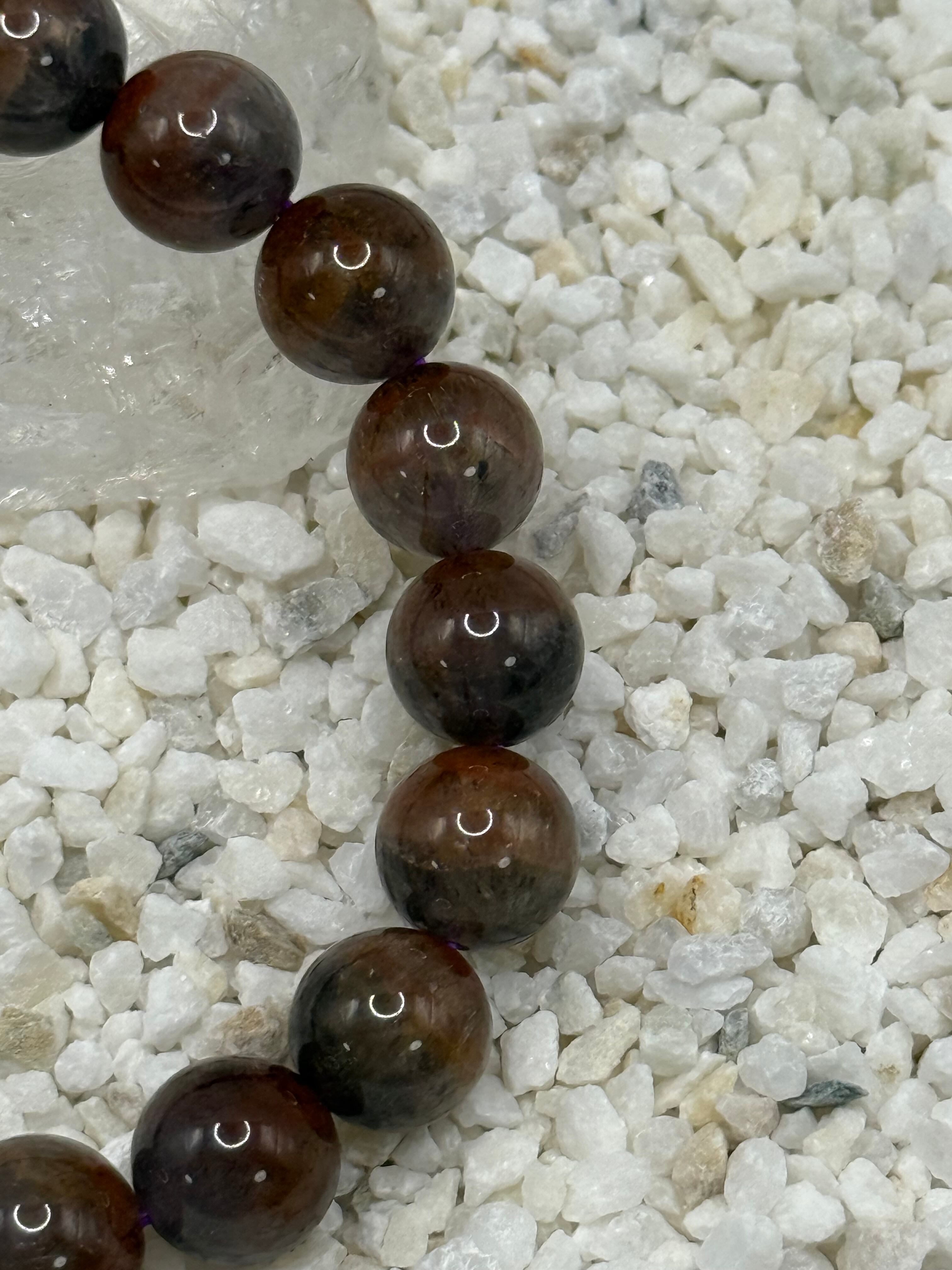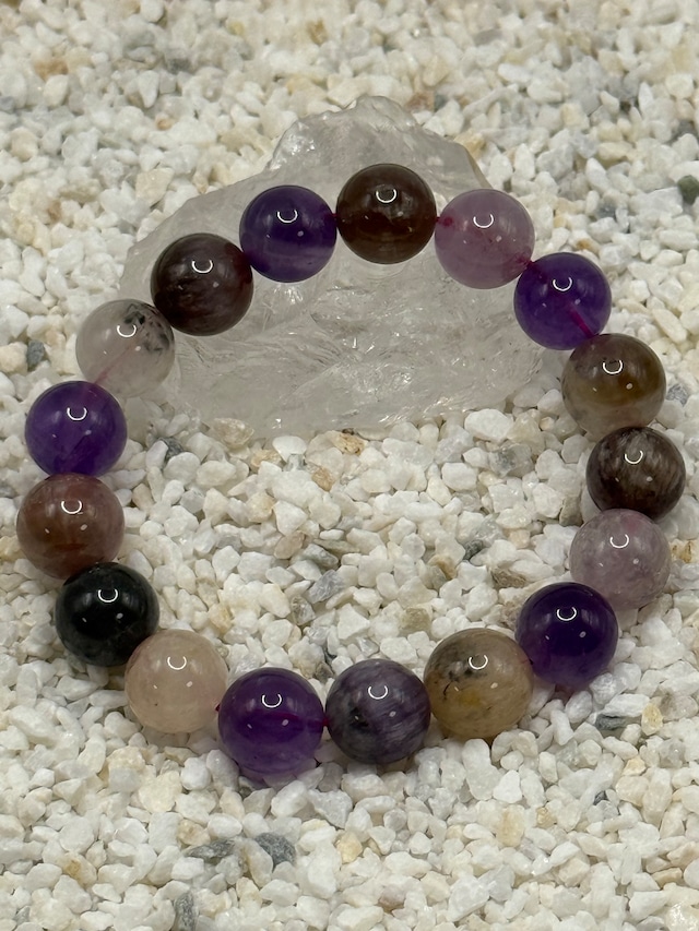 このオーラライト23 10mmブレスレットは、アメジストを母体に複数の鉱物が共生する非常に希少な天然石を使用しています。深みのある紫色を基調に、内包物が生み出す複雑で奥行きのある表情が魅力です。