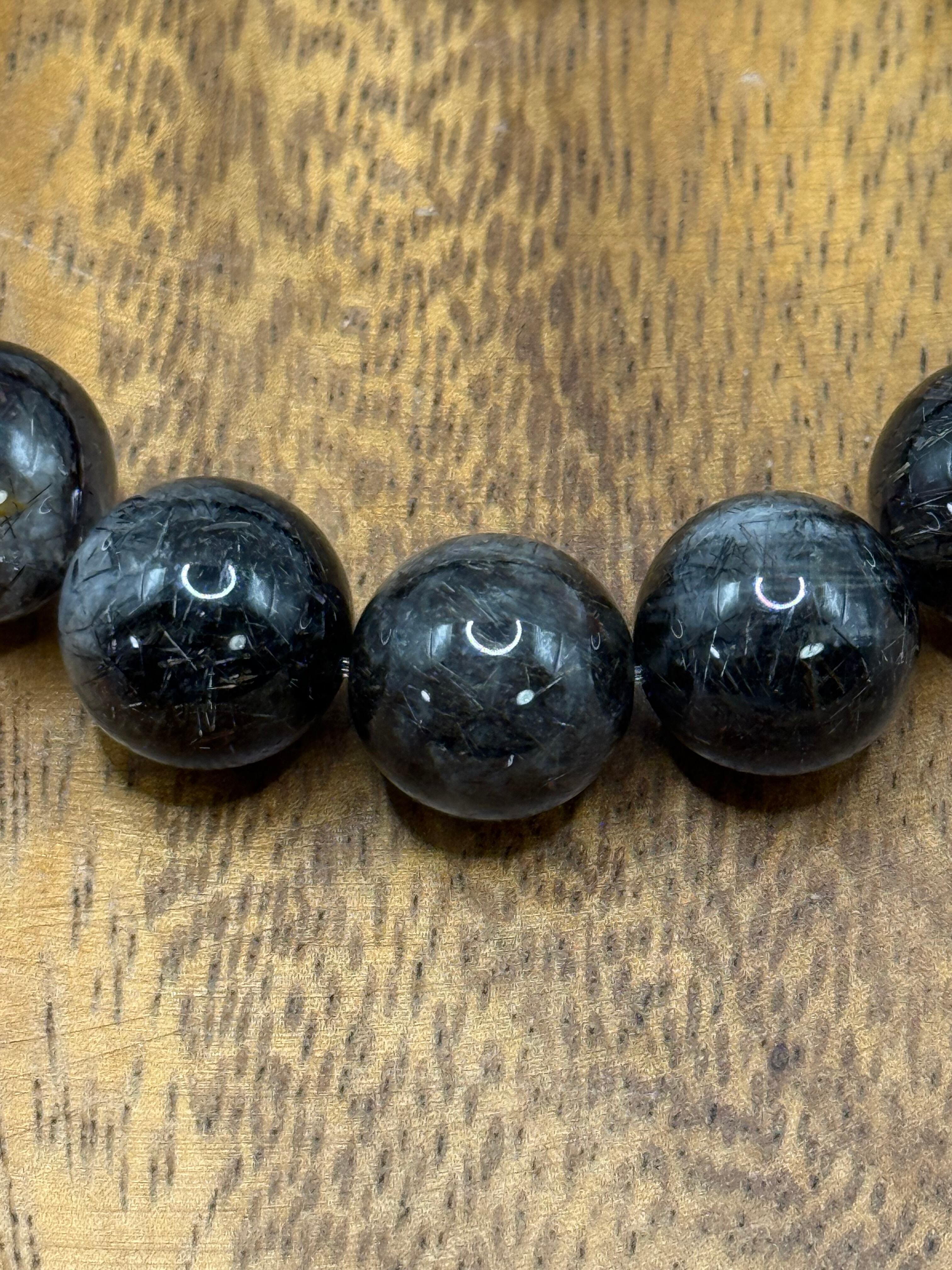 こちらは、存在感あふれる12mmサイズのブラックルチルクォーツを使用した、非常に力強い一本です。