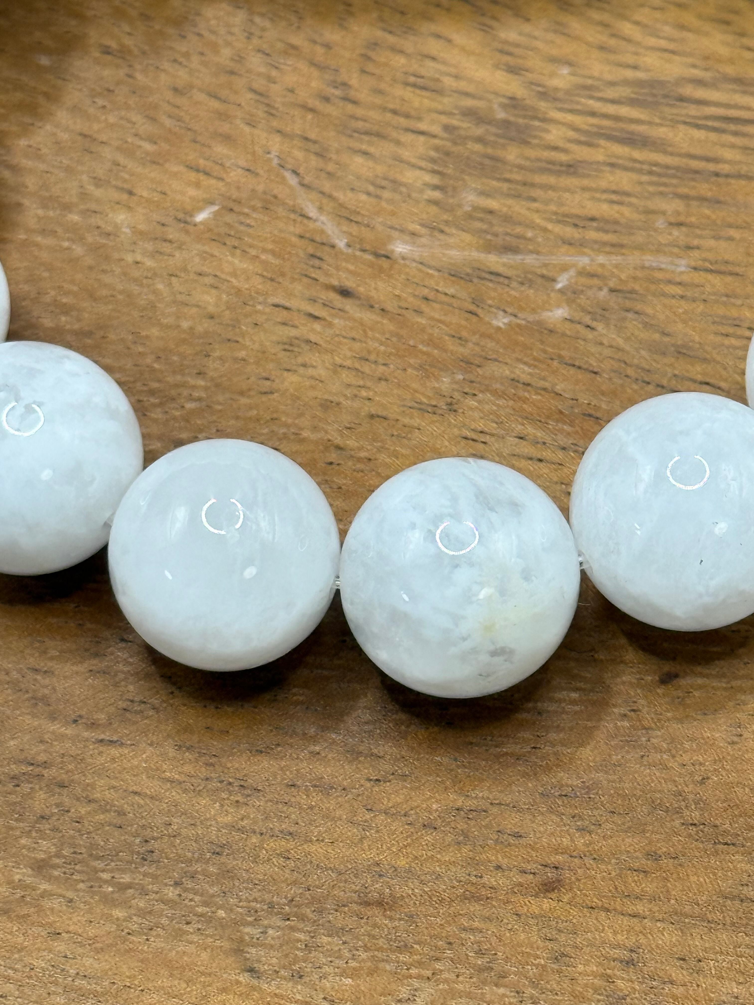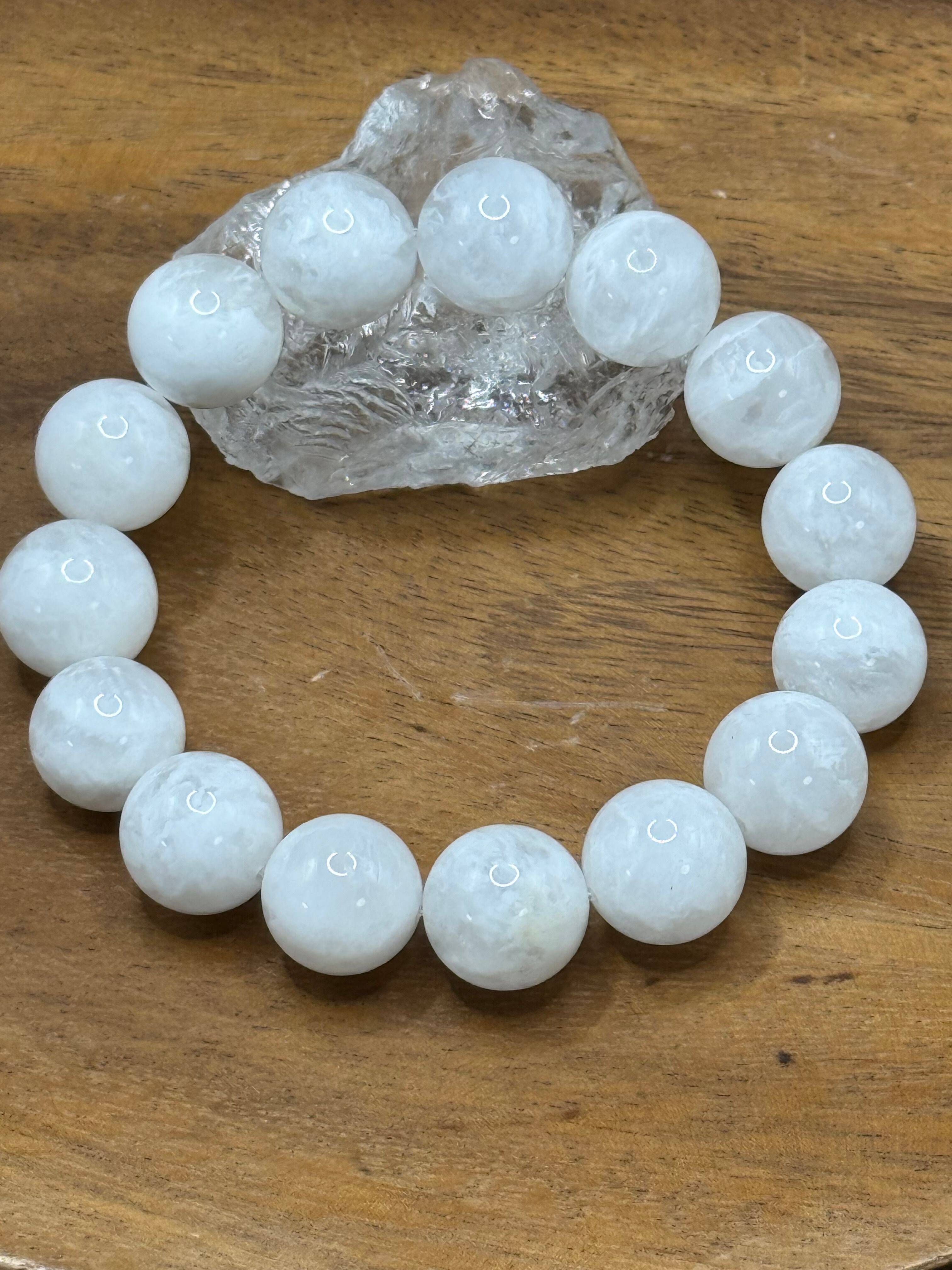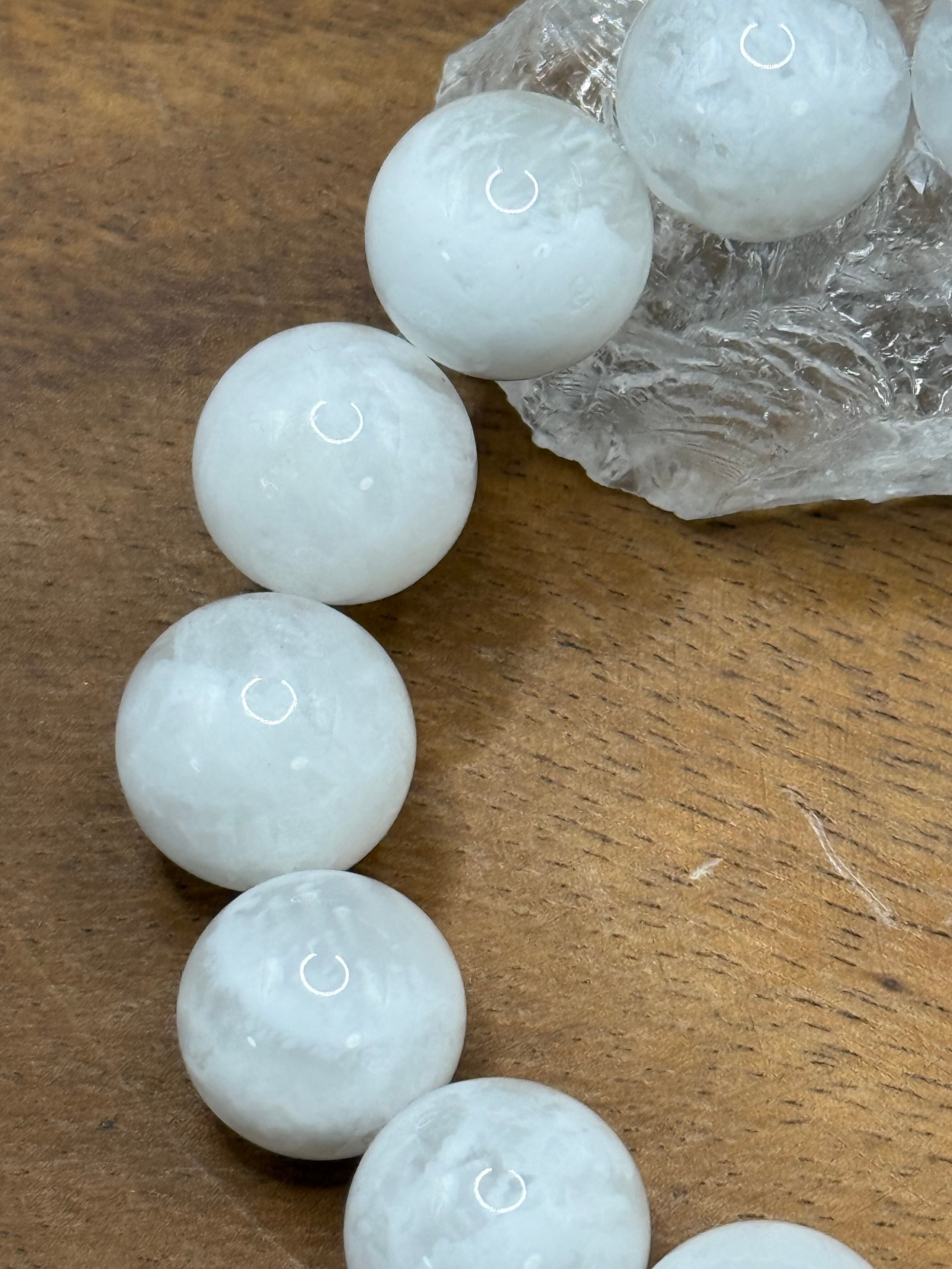 こちらは、**ホワイトフェザークォーツ(透き通った白色と独特の光沢を持つ15mmビーズ)**です。