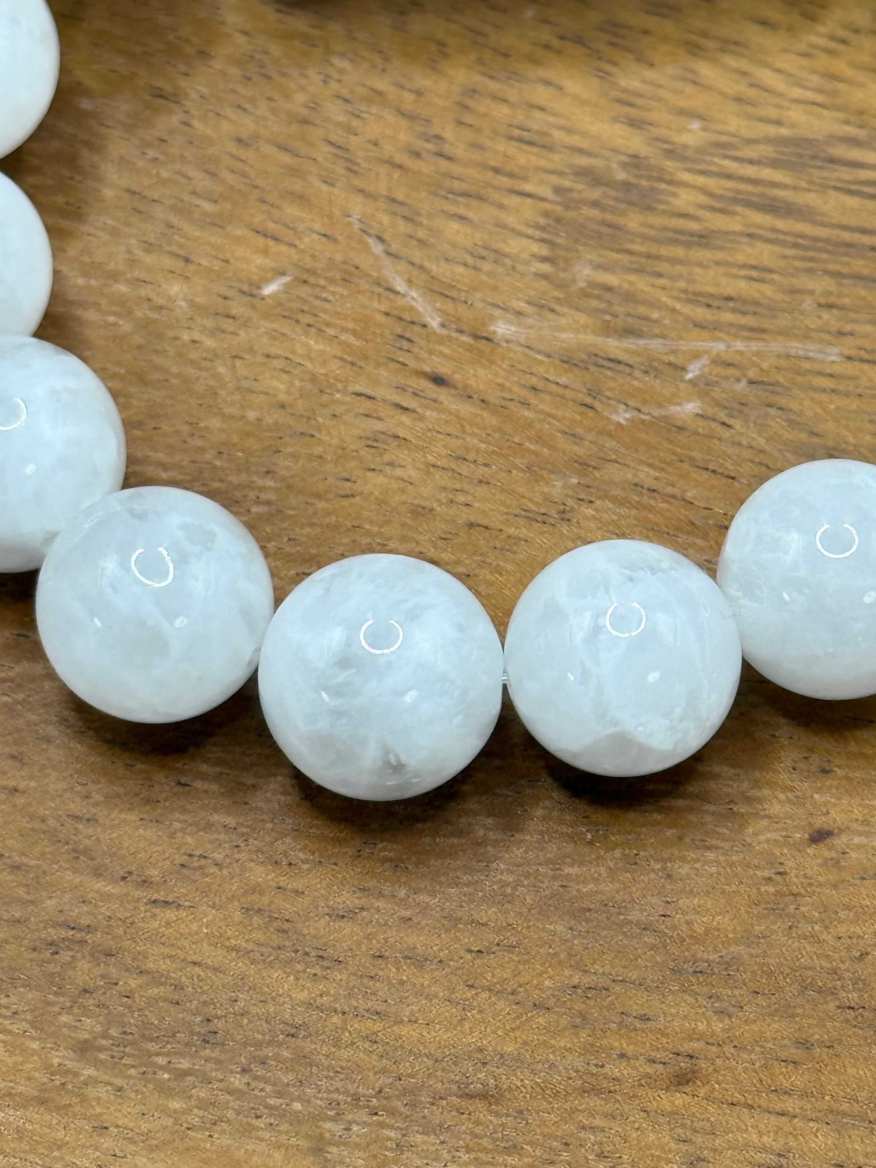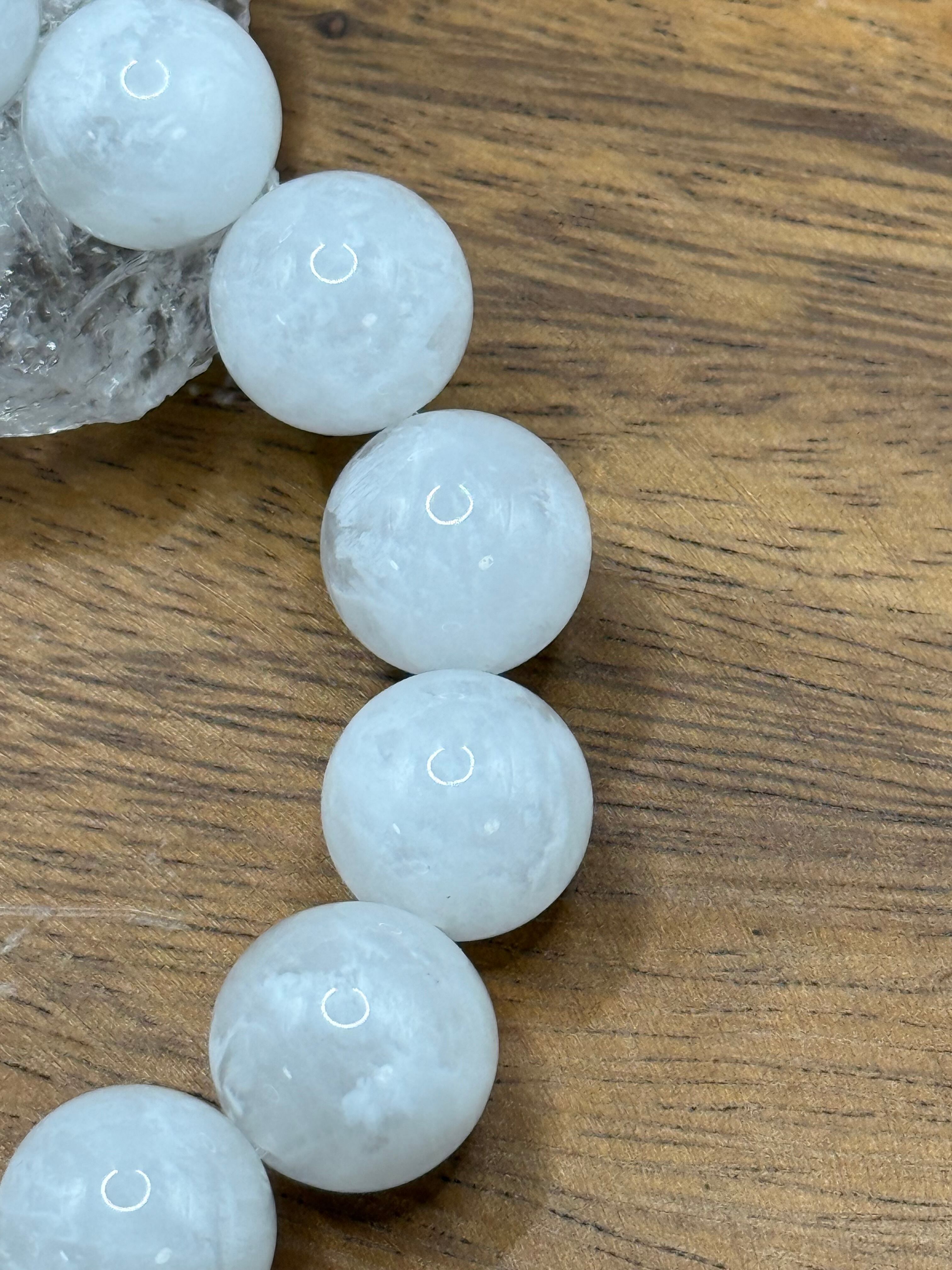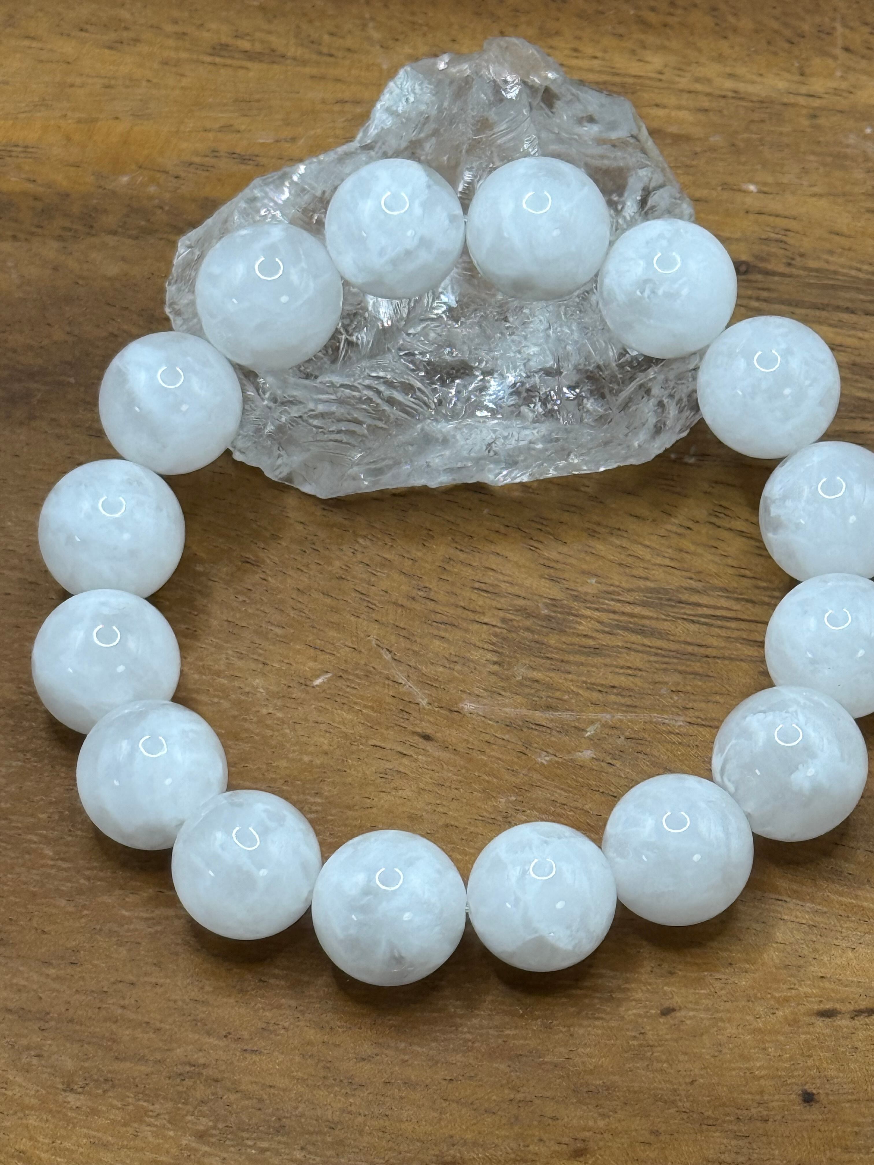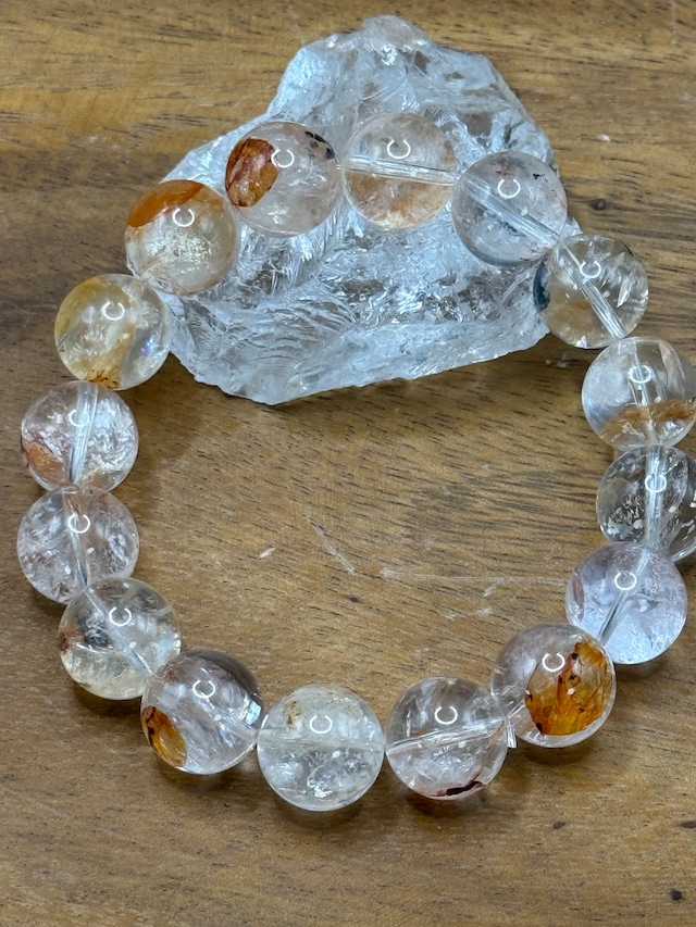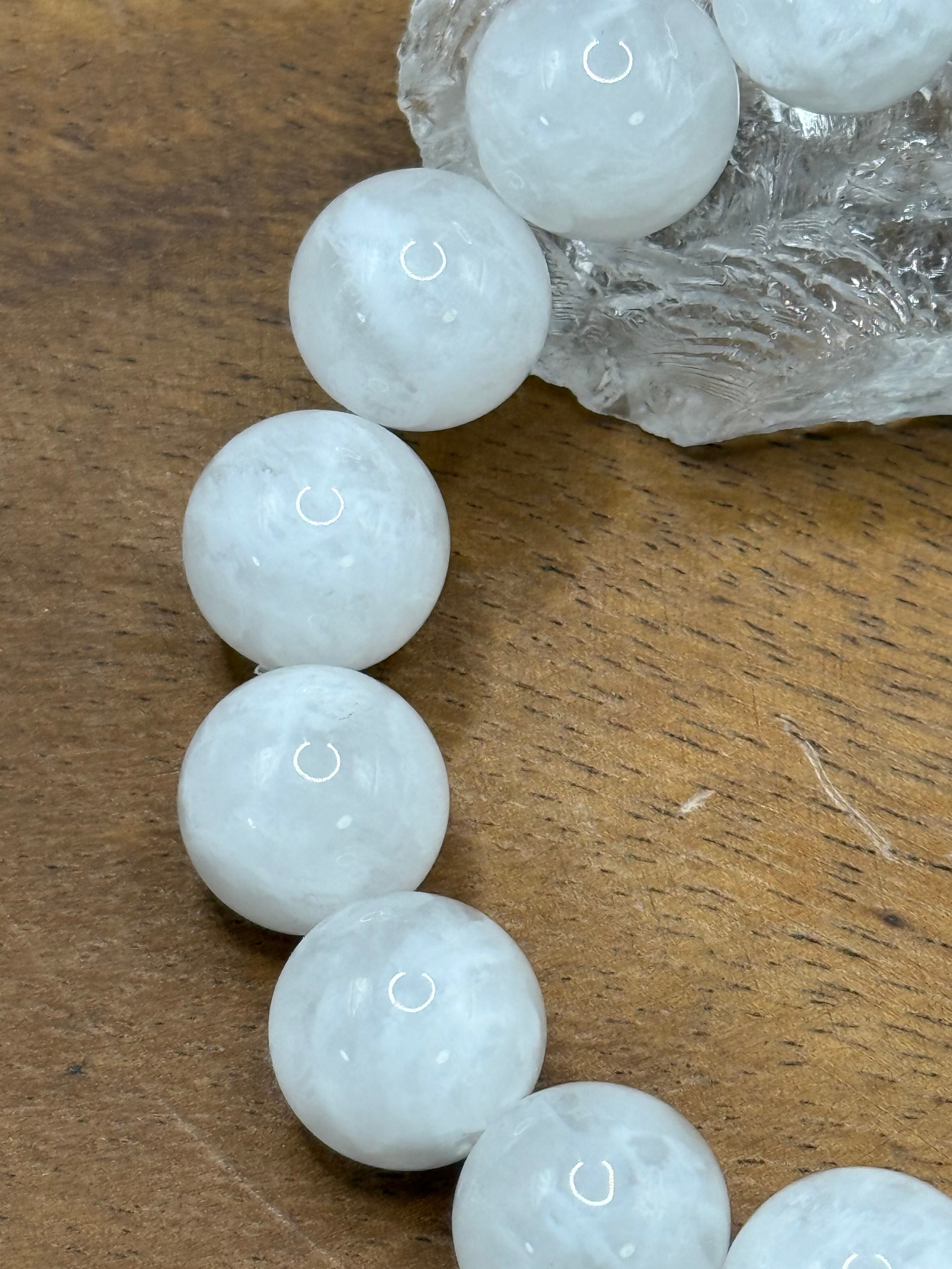 こちらは、**ホワイトフェザークォーツ(透き通った白色と独特の光沢を持つ13.5mmビーズ)**です。