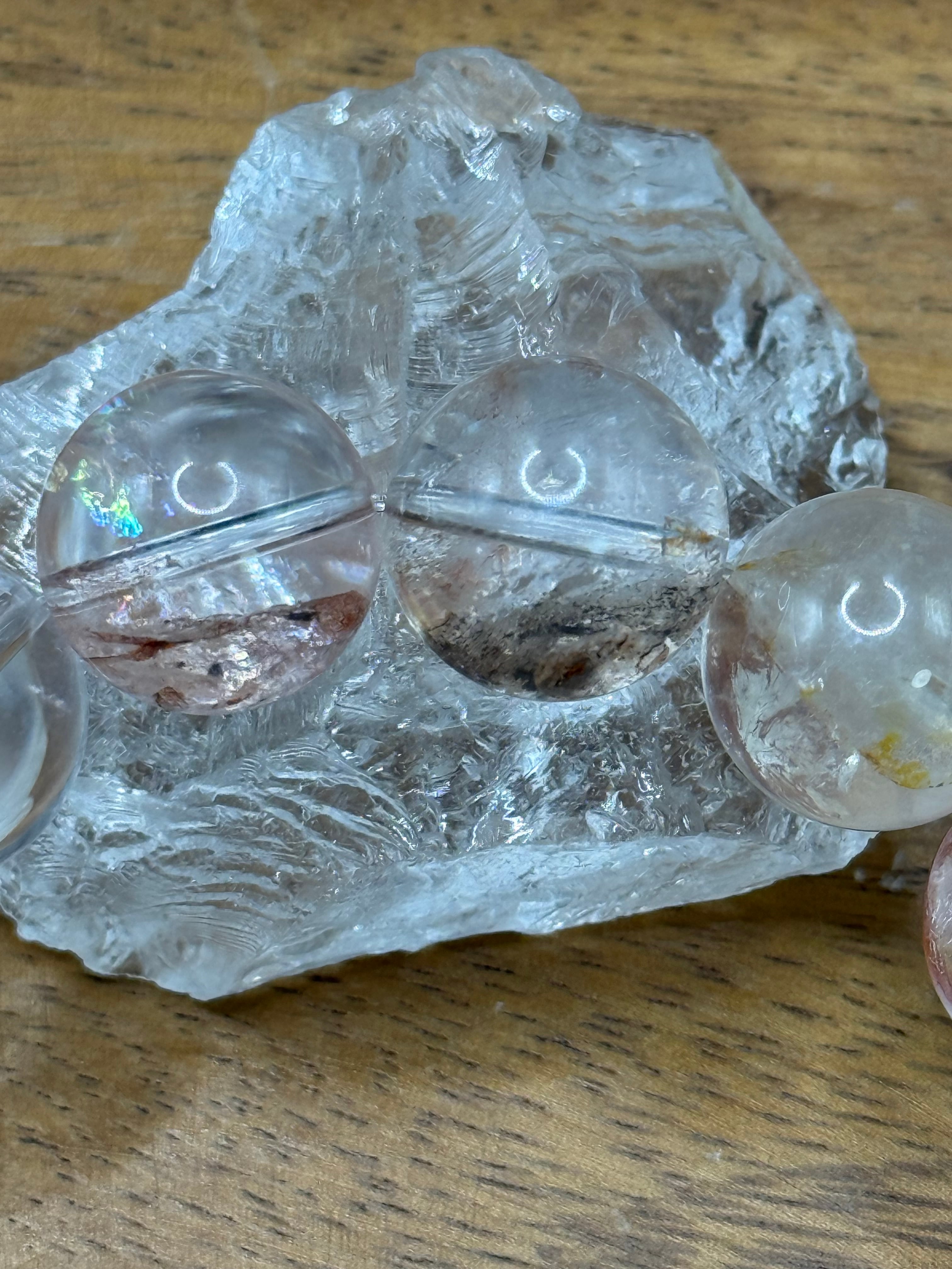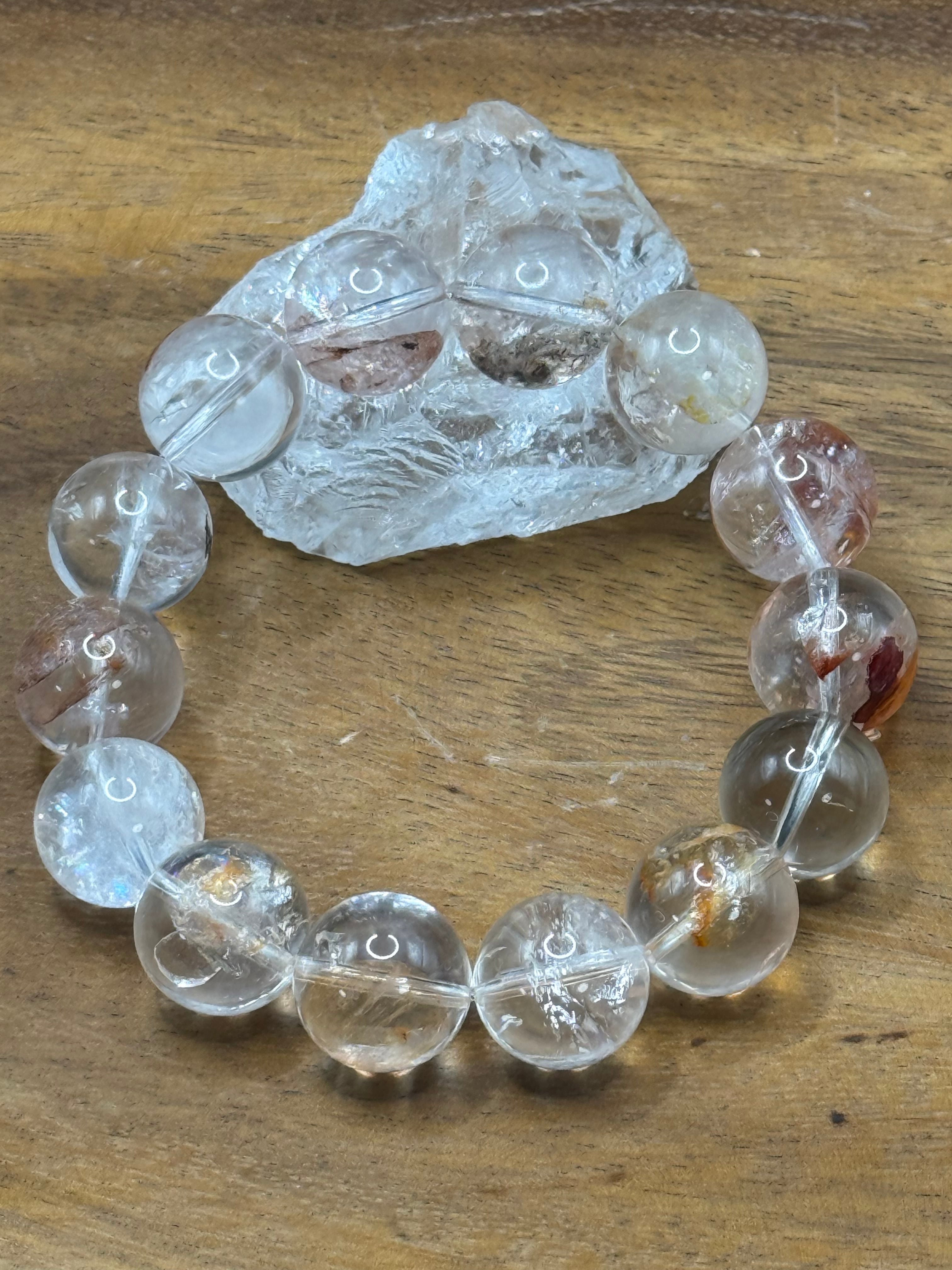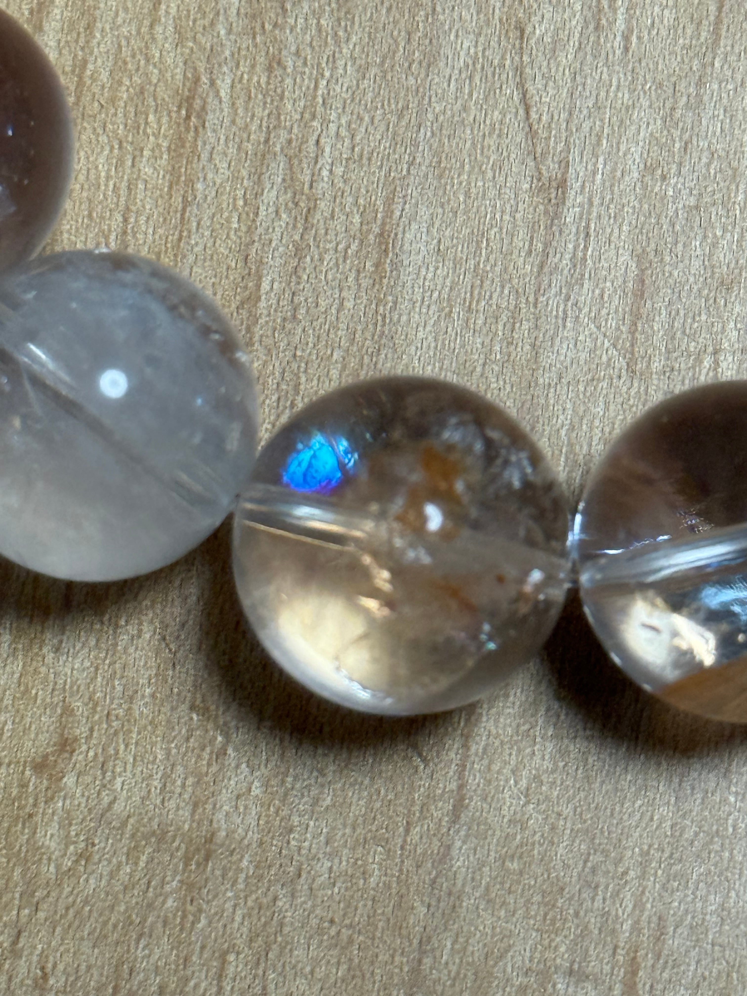 ⚫︎見た目: 乳白色の水晶に、鮮やかな赤、オレンジ、黄色の帯状模様が特徴で、光の角度で虹色(アイリス効果)が見えます。