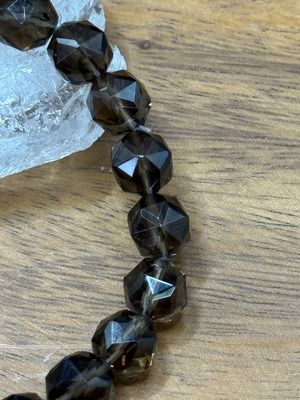 こちらは、**多面カットスモーキークォーツ(深い茶色と光沢を持つ9mmビーズ)**です。