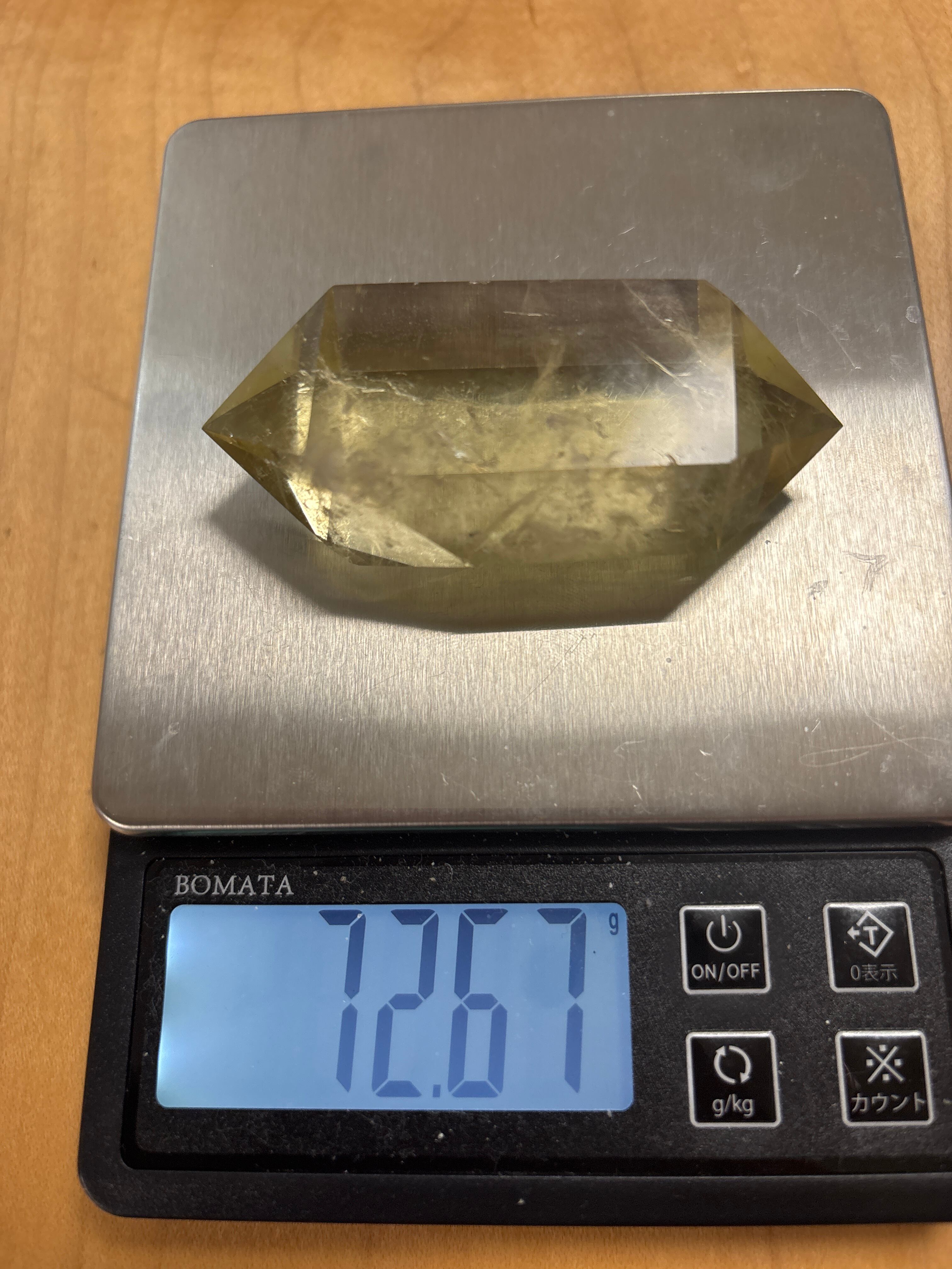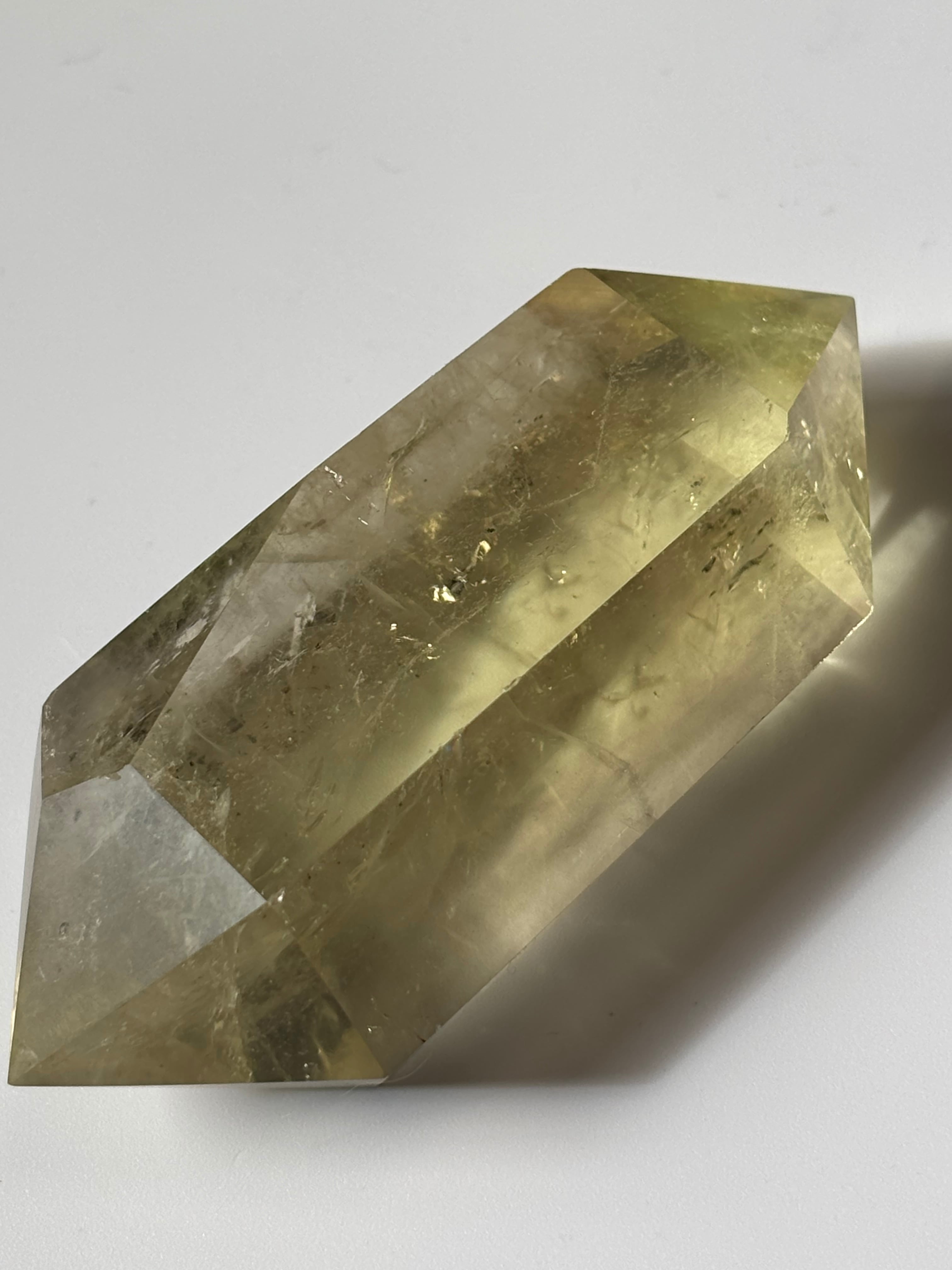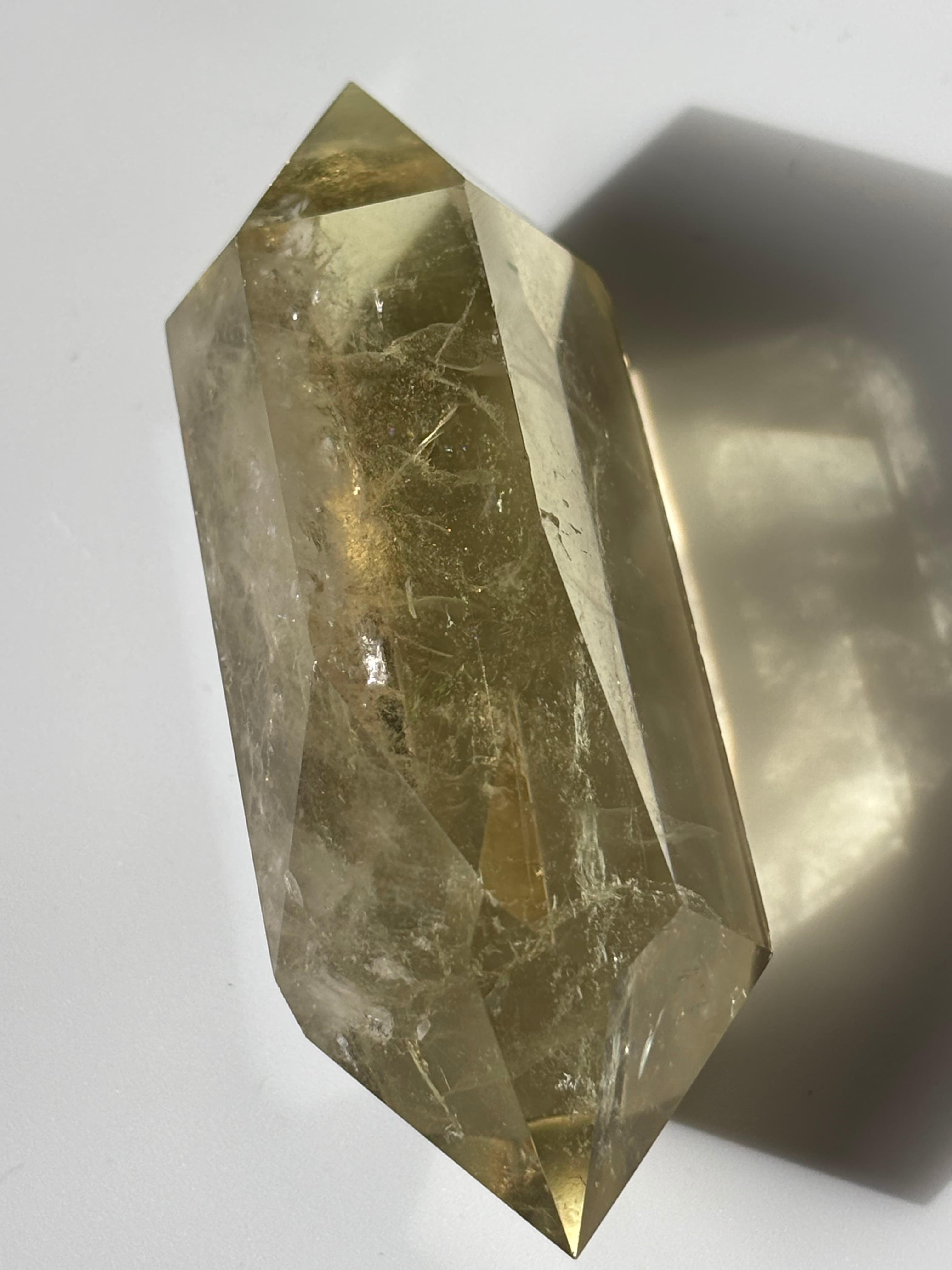 こちらのシトリンは 美しい六角形ポイントに、アイリスが入り、独自の輝きを放っています。シトリンは「富を呼ぶ石」として知られ、ポジティブなエネルギーをもたらすことで人気があります。自信や意欲を高め、財運をアップさせる力を持つこの石は、日々の生活をより豊かにするお守りとして最適です。