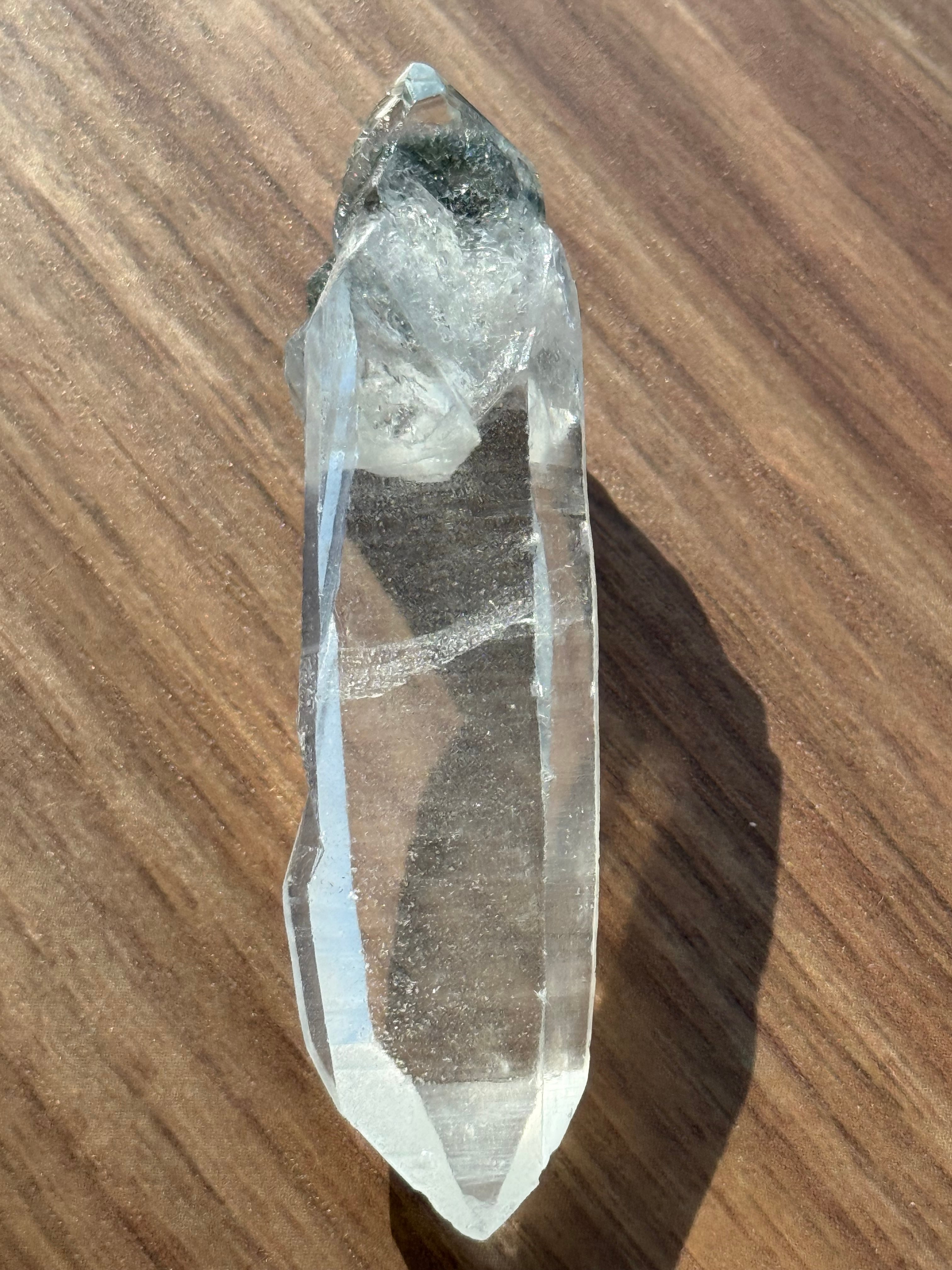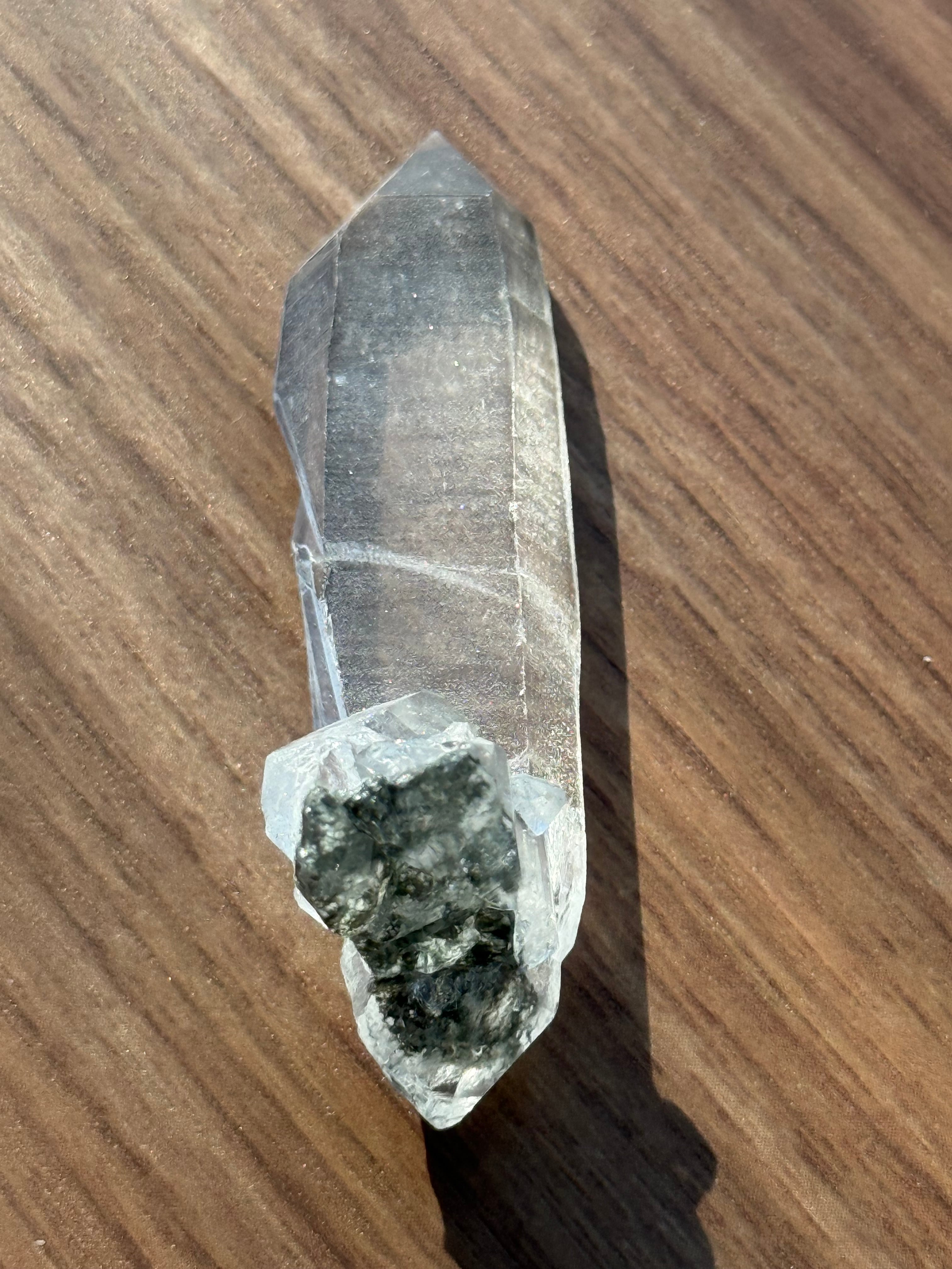 本商品は、希少なガネーシュヒマール水晶の美しい結晶です。クリアで澄んだ透明感が、自然の力を存分に感じさせる特別な存在となっています。ガネーシュヒマール特有の緑のクローライトもしっかり確認できます。