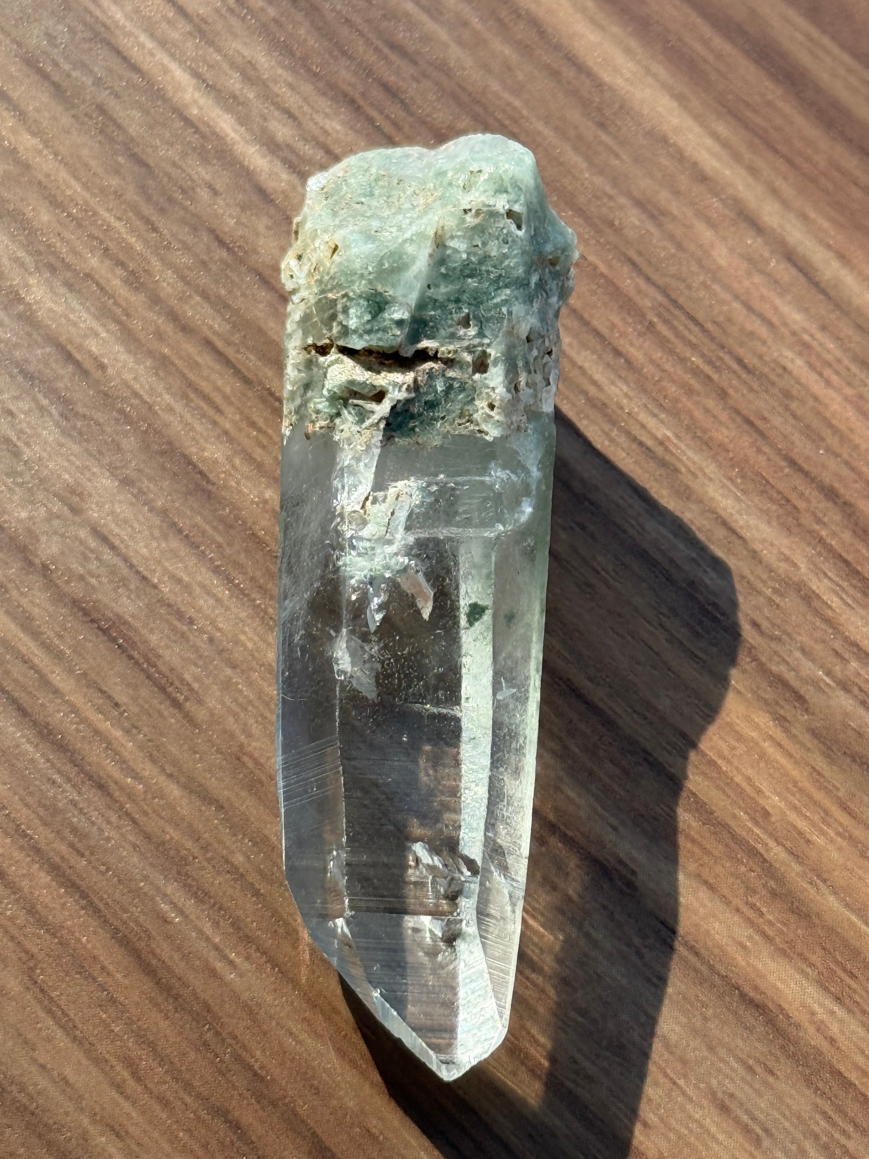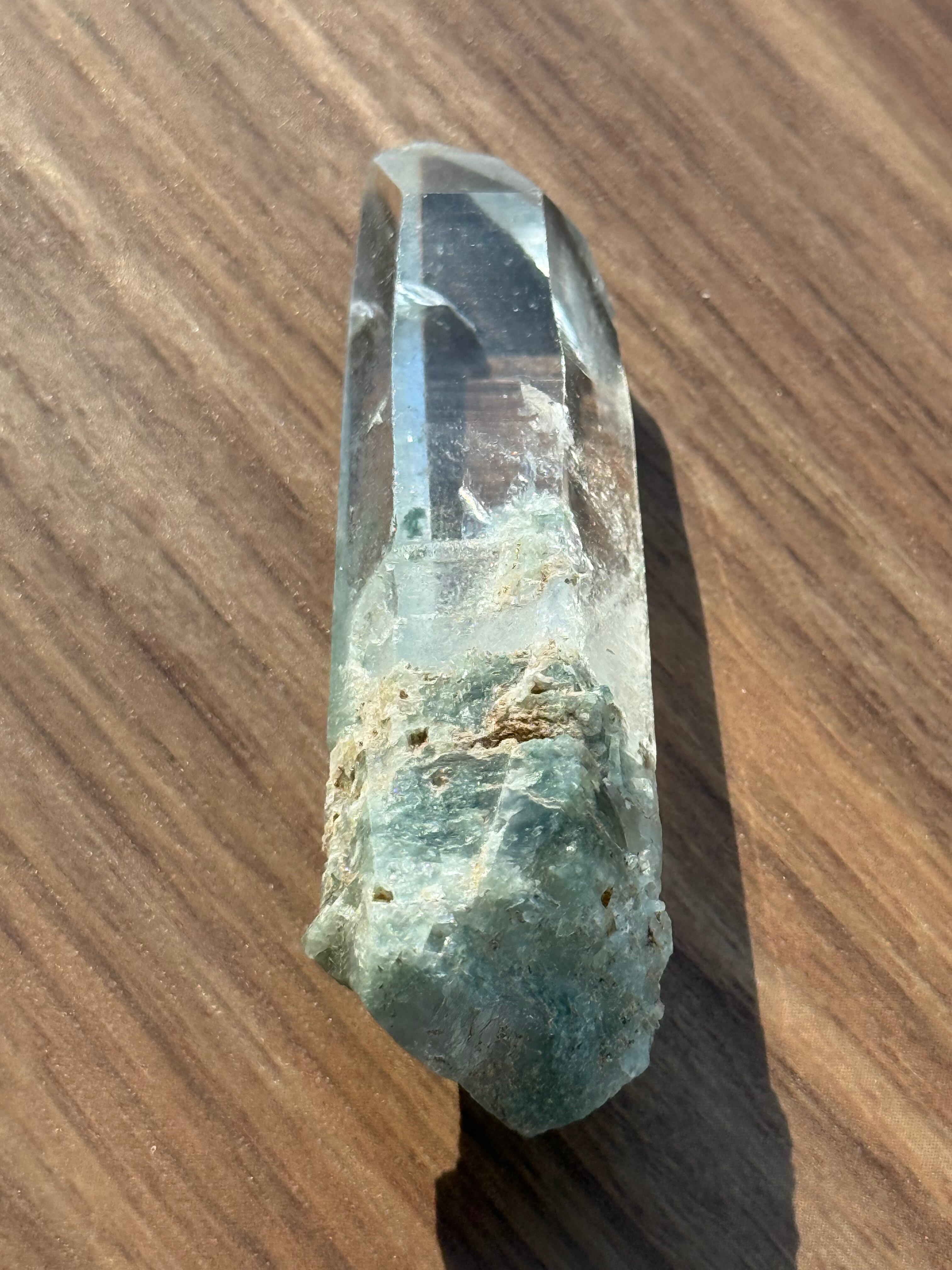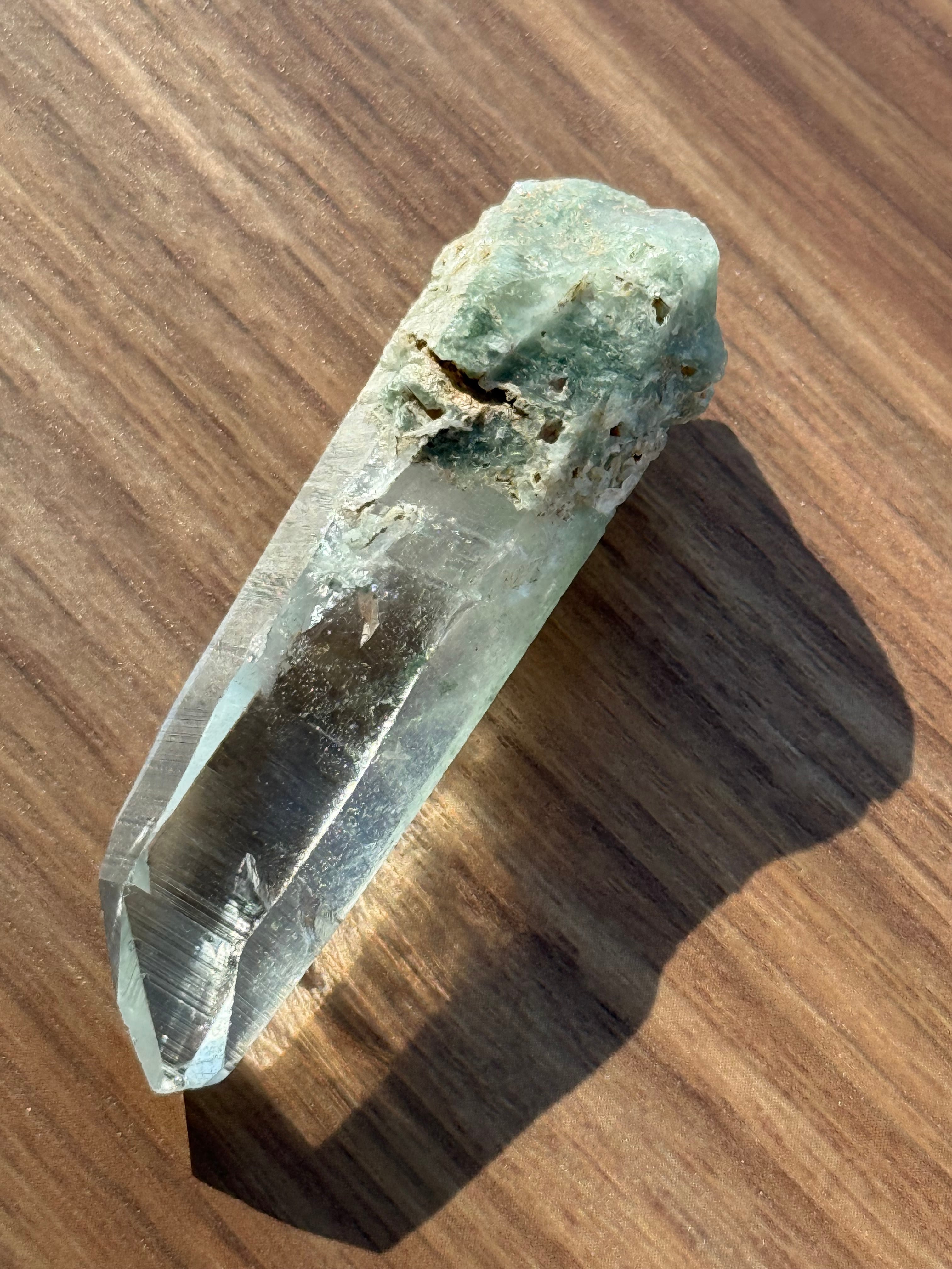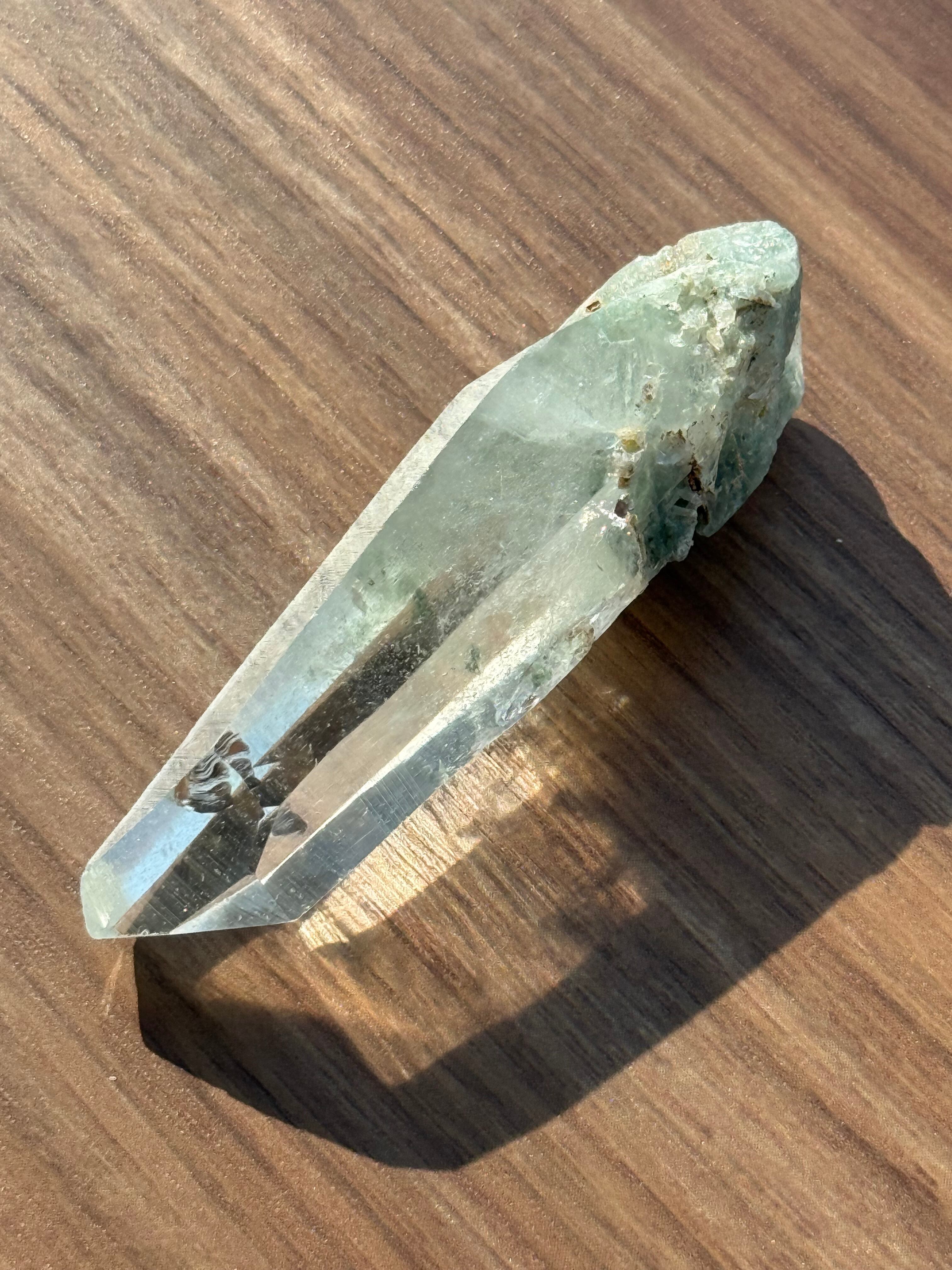 本商品は、希少なガネーシュヒマール水晶の美しい結晶です。クリアで澄んだ透明感が、自然の力を存分に感じさせる特別な存在となっています。ガネーシュヒマール特有の緑のクローライトもしっかり確認できます。