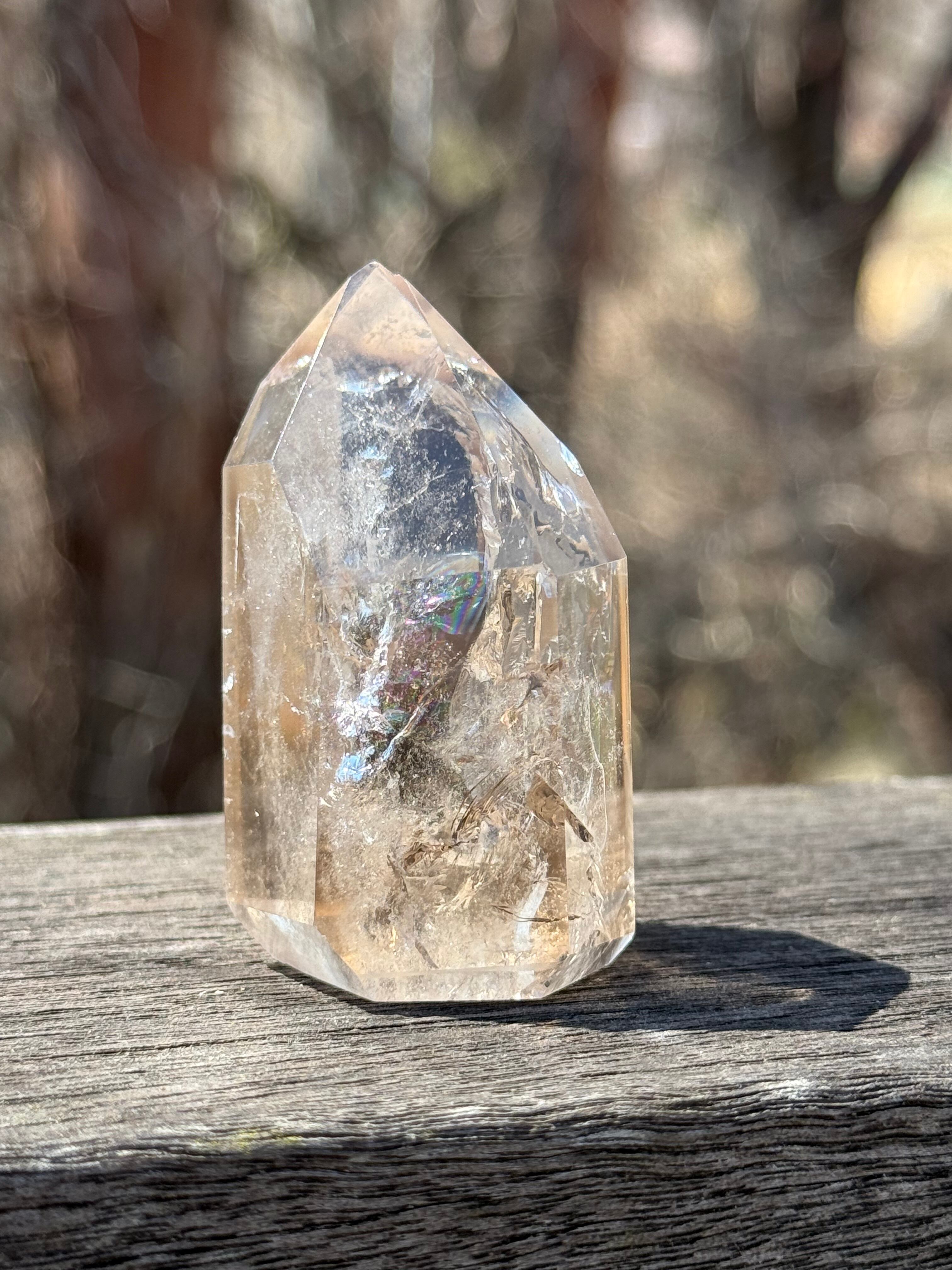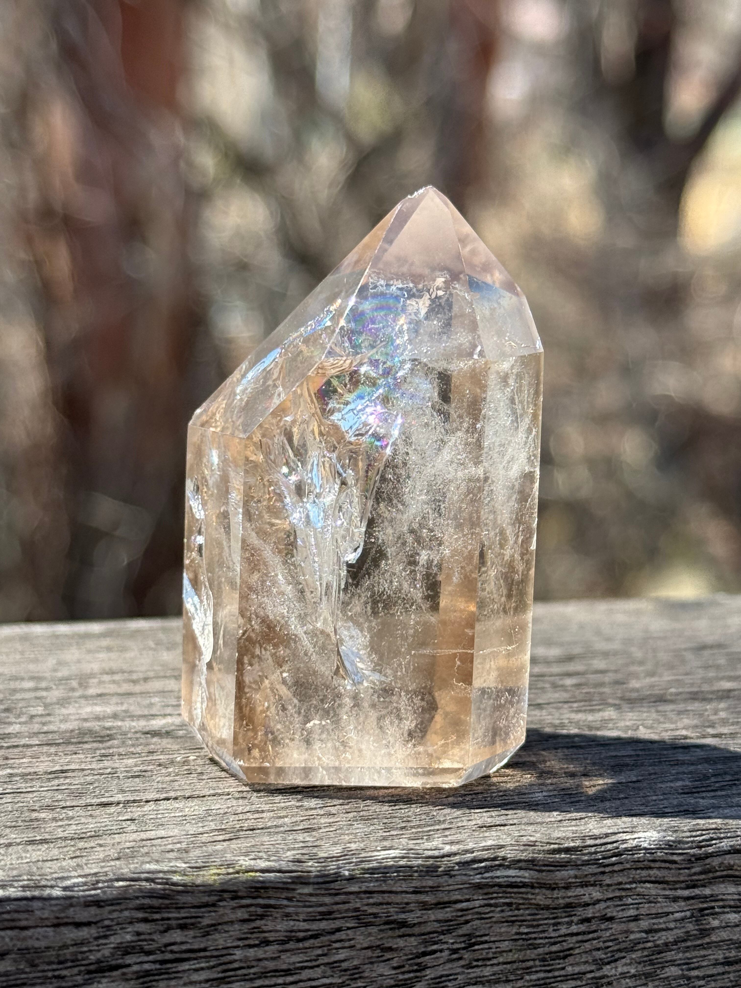 本商品は、トマスゴンサガ産の美しい水晶ポイントです。透明感に優れ、自然の美しさをそのまま感じられる特別な存在となっています。優れたアイリス効果が光の中で魅力を放ち、見ているだけで心を豊かにしてくれるでしょう。