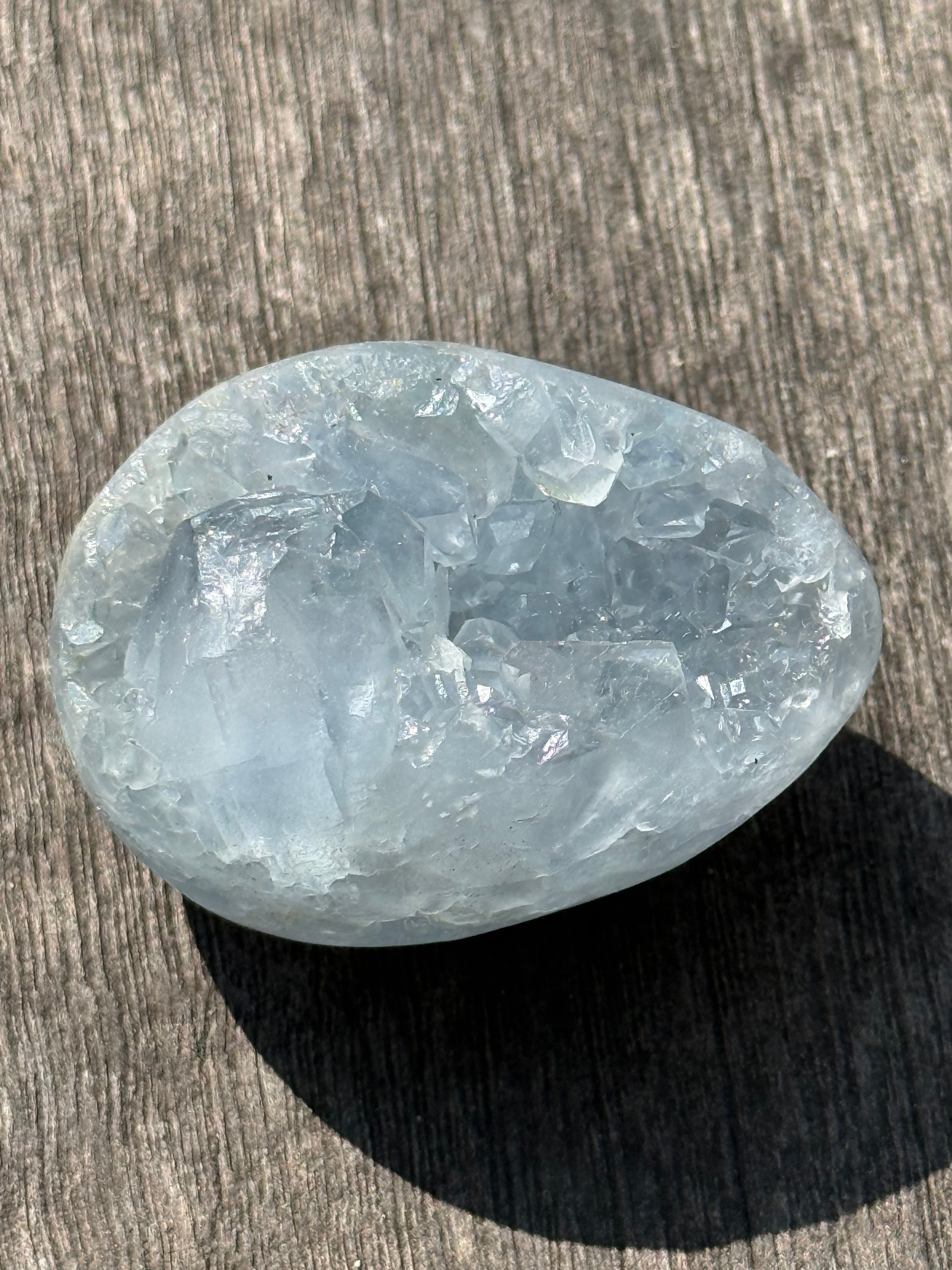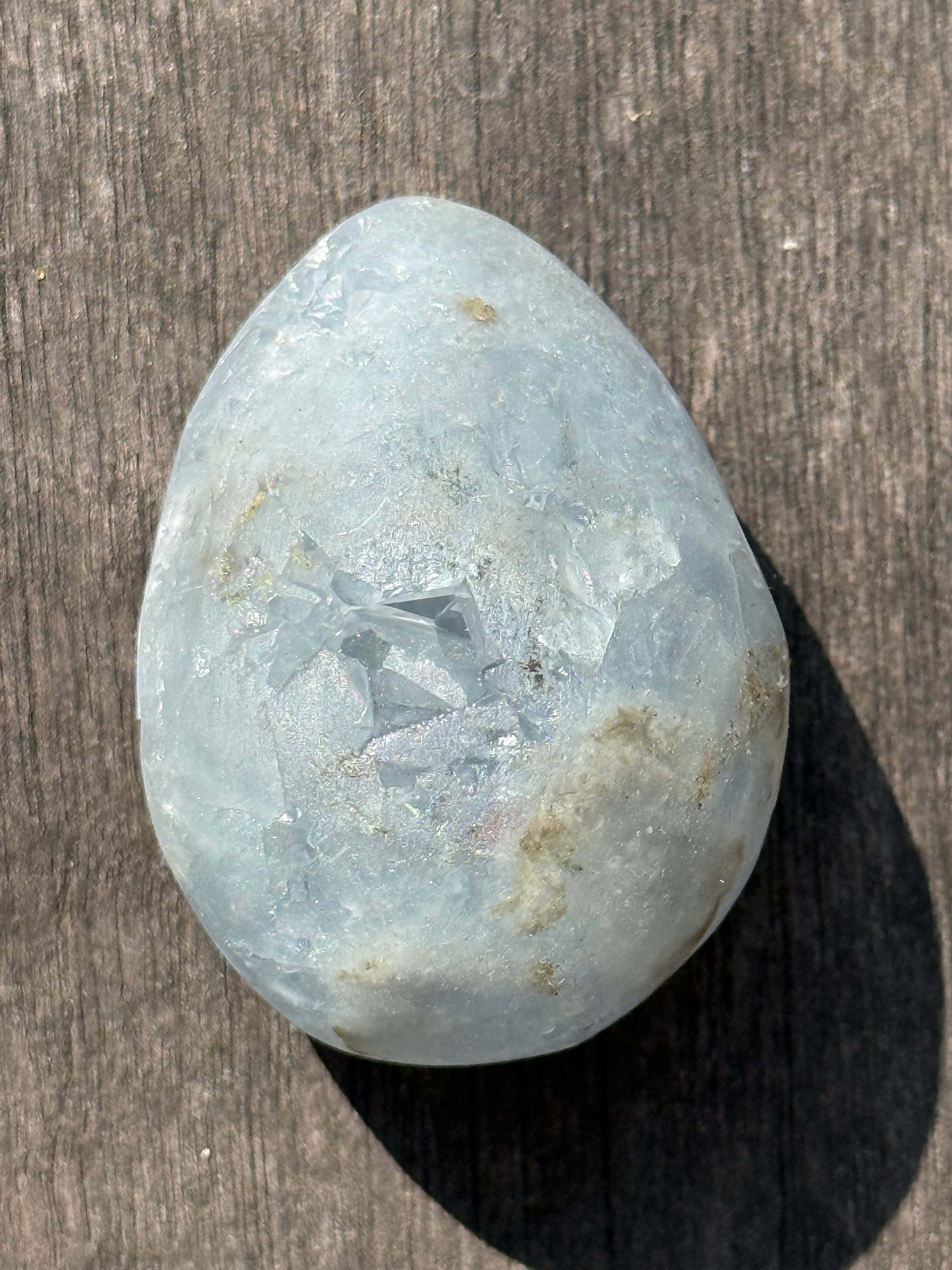 こちらは、透明感あふれる優しい色合いのセレスタイトで作られたエッグ型のアイテムです。天然・無着色にこだわり、その美しい光沢と深い色合いをお楽しみいただけます。