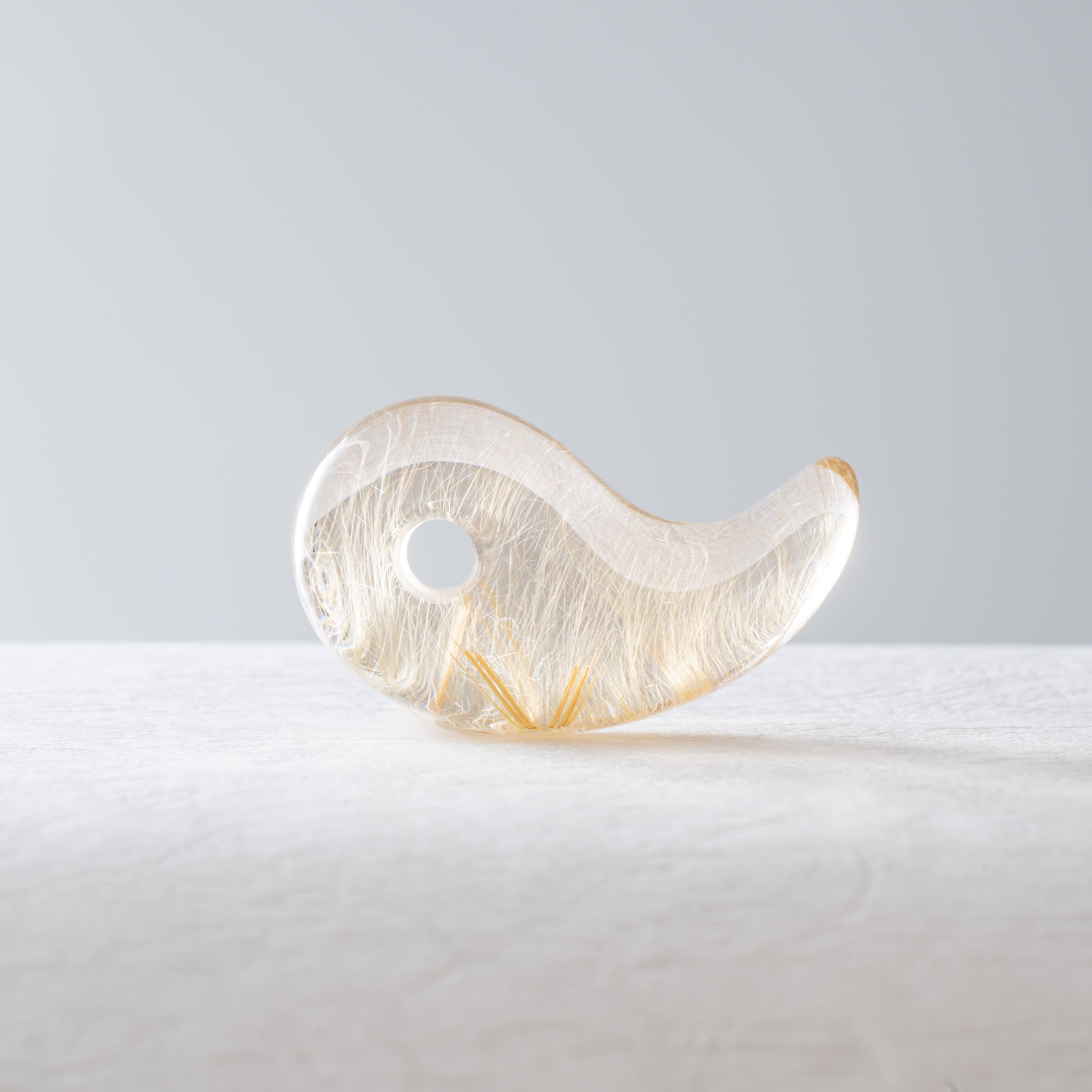 希少で美しいルチルクォーツは、きらびやかな金色の針(ルチル)が特徴的で、透明感のある輝きが心を奪います。この石は、日本の職人の手によって丁寧に加工され、その完成度は高く評価されています。持つことで、エネルギーの浄化や自己を見つめ直すきっかけとなるでしょう。