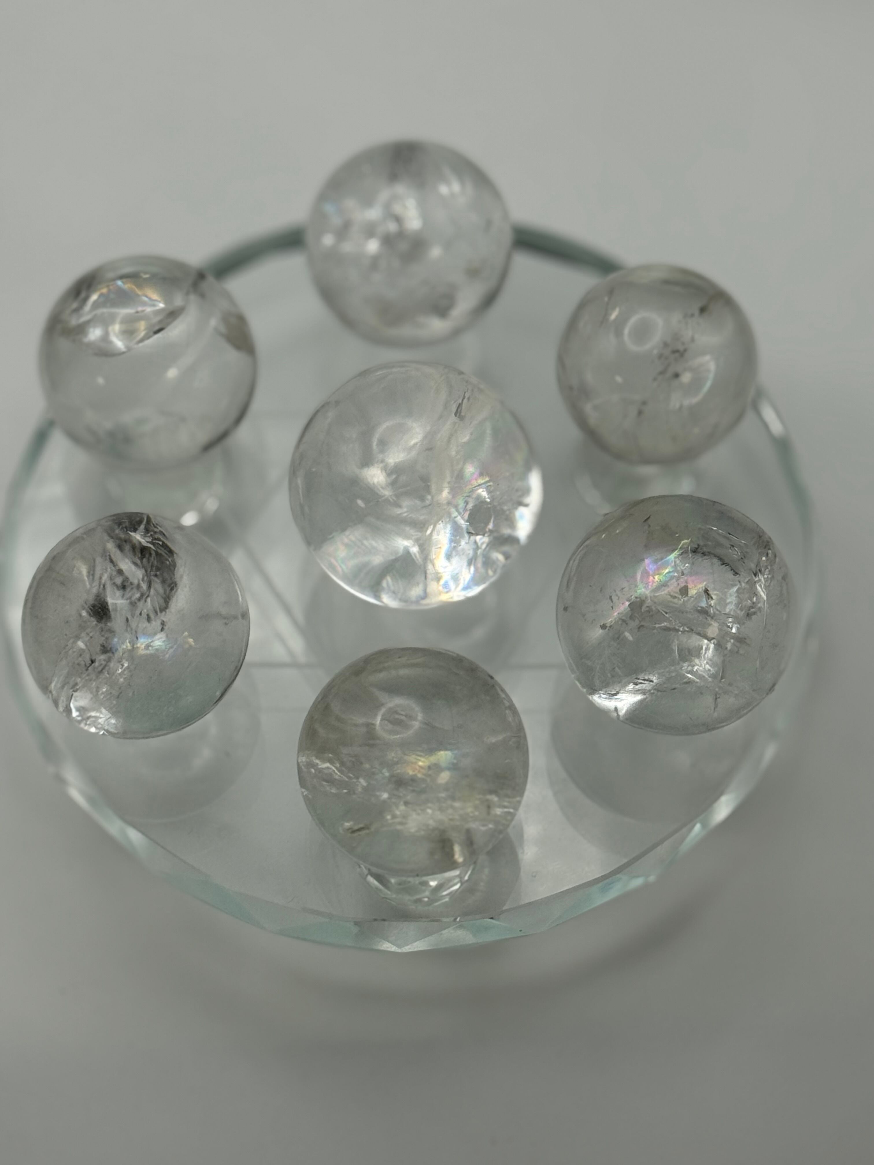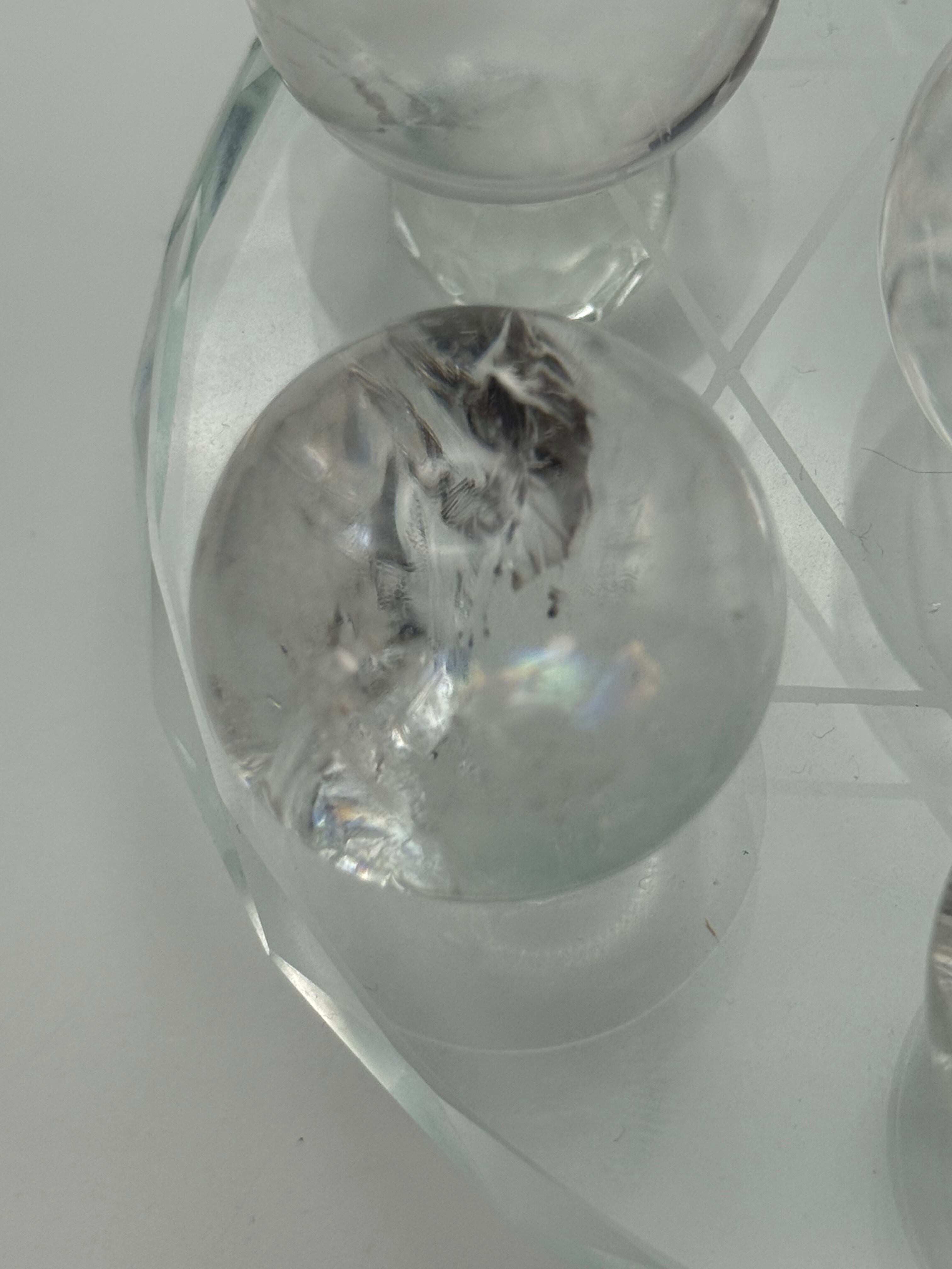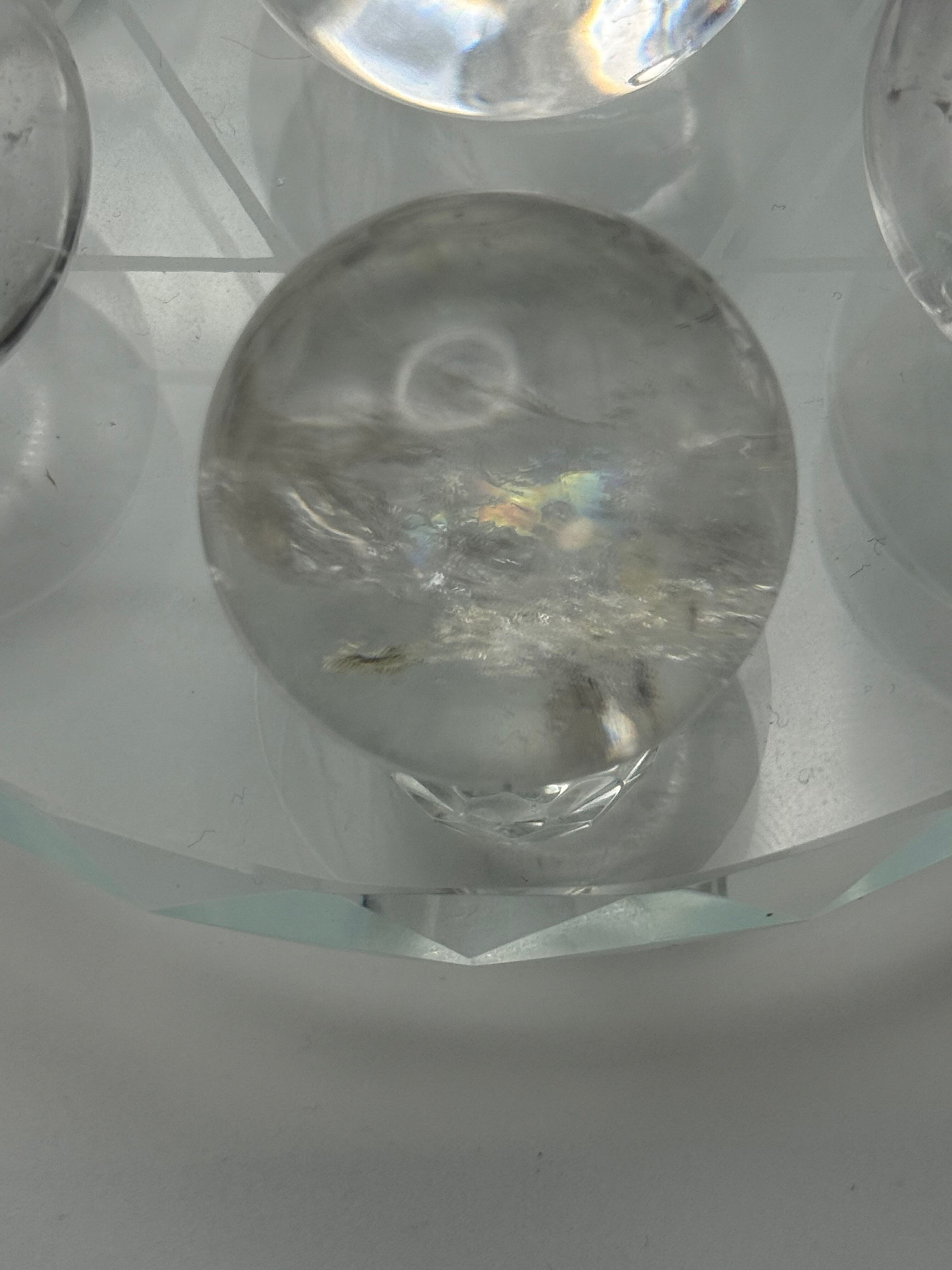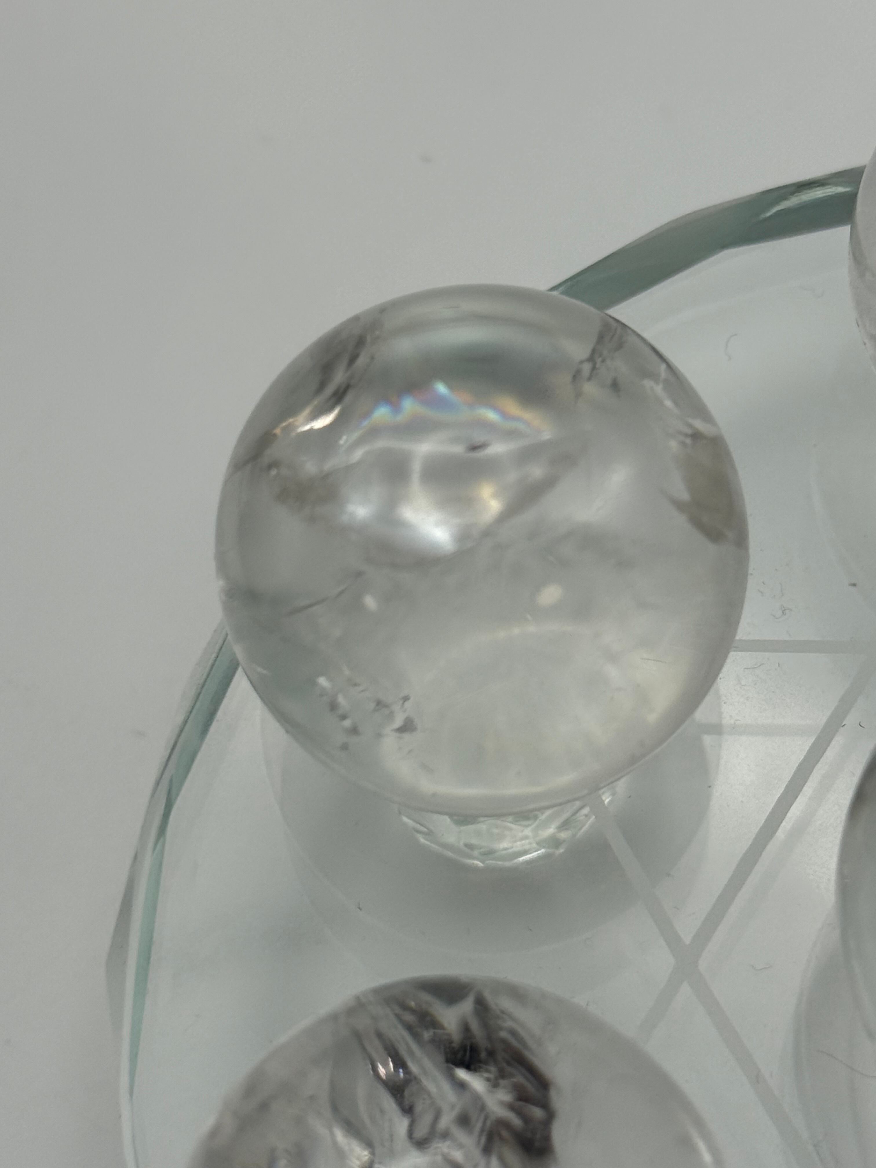 透明感のある美しい水晶の中に、自然が生み出したクラックや内包感が見られる、レムリアン水晶の丸玉で構成された六芒星インテリアになります。